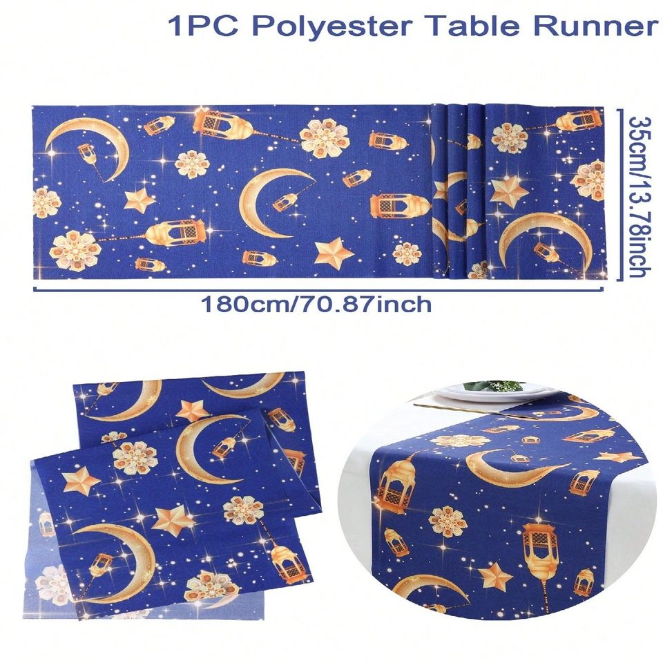 Camino de Mesa Azul Oscuro con Luna Creciente Dorada, Estrellas y Faroles para Decoración de Mesa de Comedor en Ramadán y Eid, Tela Elegante y Lavable