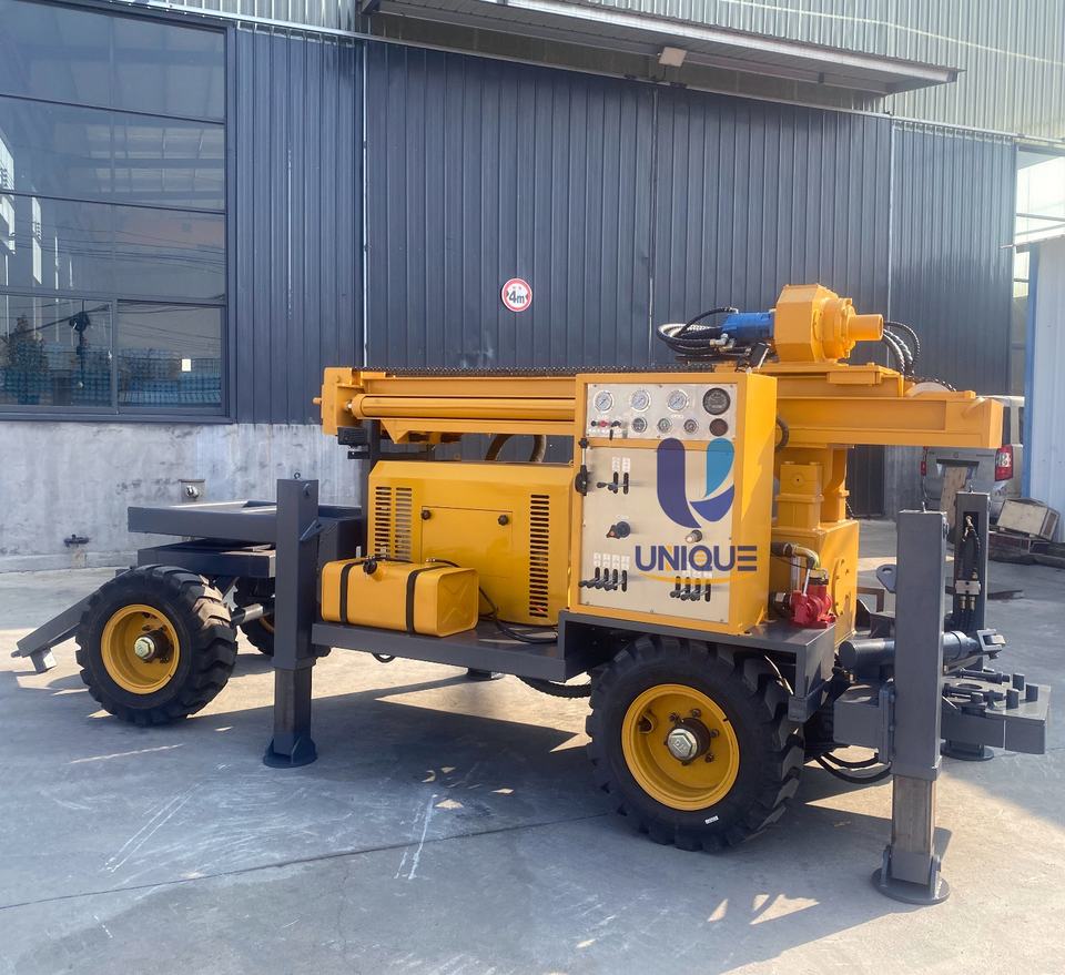 Plataforma de perforación rotativa de pozo profundo, máquina única de 180m/200m/300m/400m, plataforma de pozo de agua hidráulica de rueda para plataforma de perforación de mina de roca