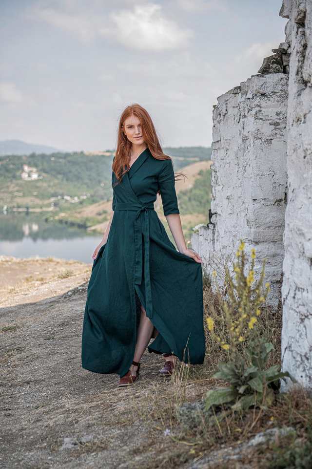 Nombre del Producto:Vestido Maxi Envolvente de Lino Verde Oscuro
