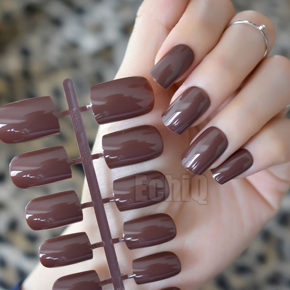 Uñas postizas de Chocolate, brillantes, cuadradas, largas, de Gel sólido marrón, con adhesivo de pegamento