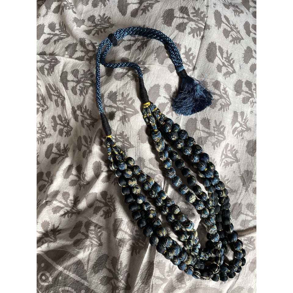 Collar de Cuentas Sari Azul Marino Profundo de Cinco Hilos, Vintage, Religioso, Chapado en Oro, con Borla de Concha de Cobre y Perlas - Para Fiestas y Regalos