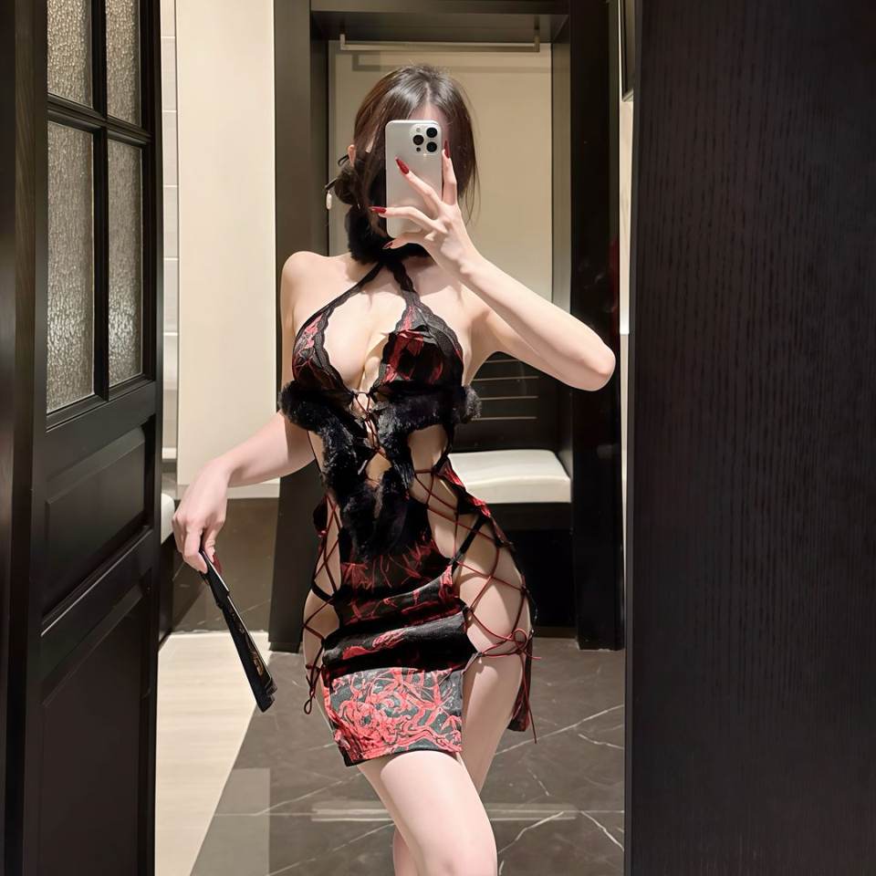 Camisón de red con escote en V profundo, uniforme de cosplay, lencería babydoll, lencería sexy con ribete de encaje para mujer, talla única, lencería sin entrepierna