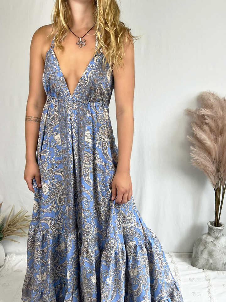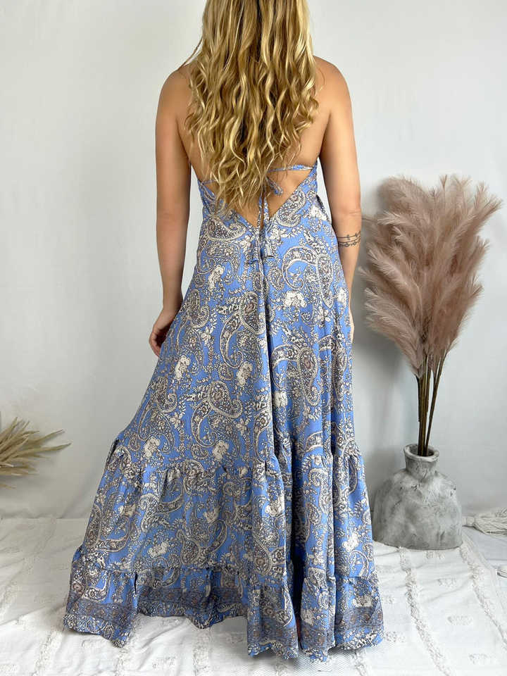 Vestido largo sin espalda con cuello en V profundo 2025 nueva llegada verano Sexy vestido sin mangas con cuello en V profundo vestido Maxi estampado Floral para mujer
