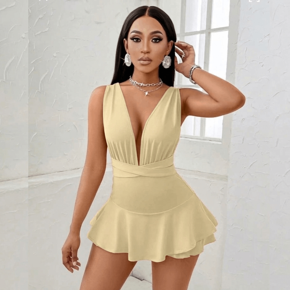 Minivestido o mono con cuello en V profundo, espalda cruzada y dobladillo con volantes