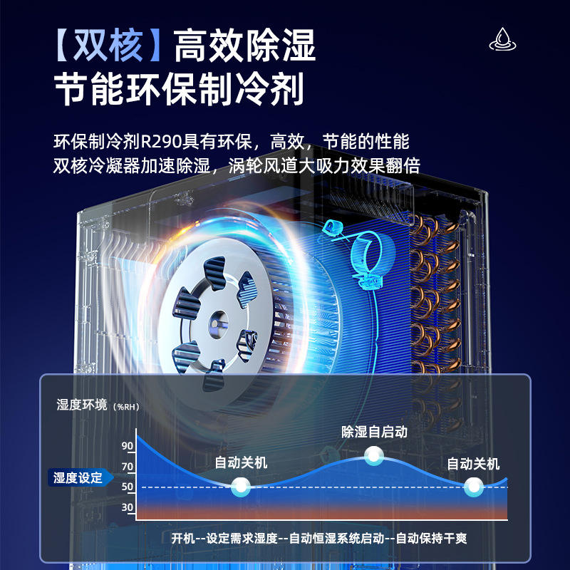 Deshumidificador de 50L diarios con WiFi, modelo R290, refrigerante con control automático de humidistato para la industria comercial.
