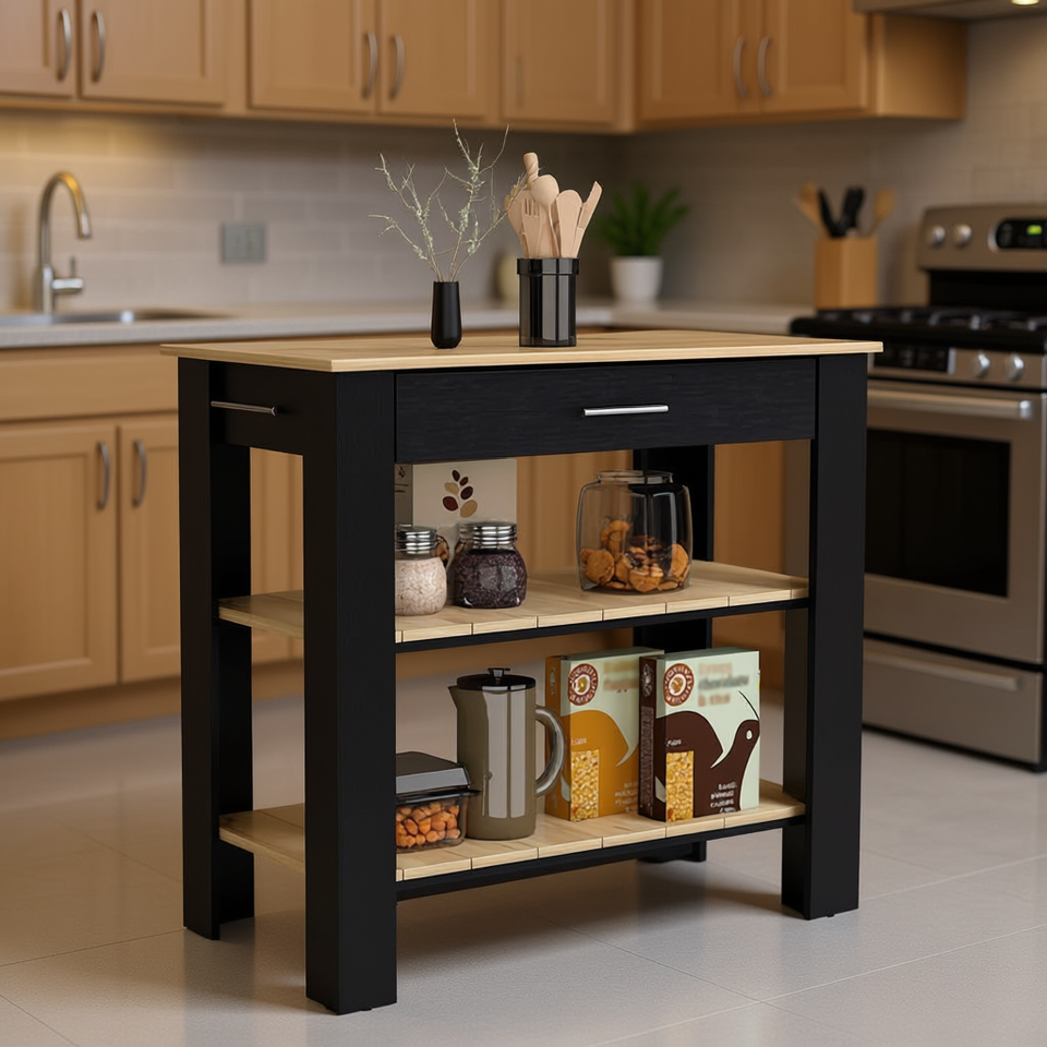 Isla de Cocina Delos con un Cajón y Dos Estantes, Madera de Roble Claro Negro, Diseño Moderno