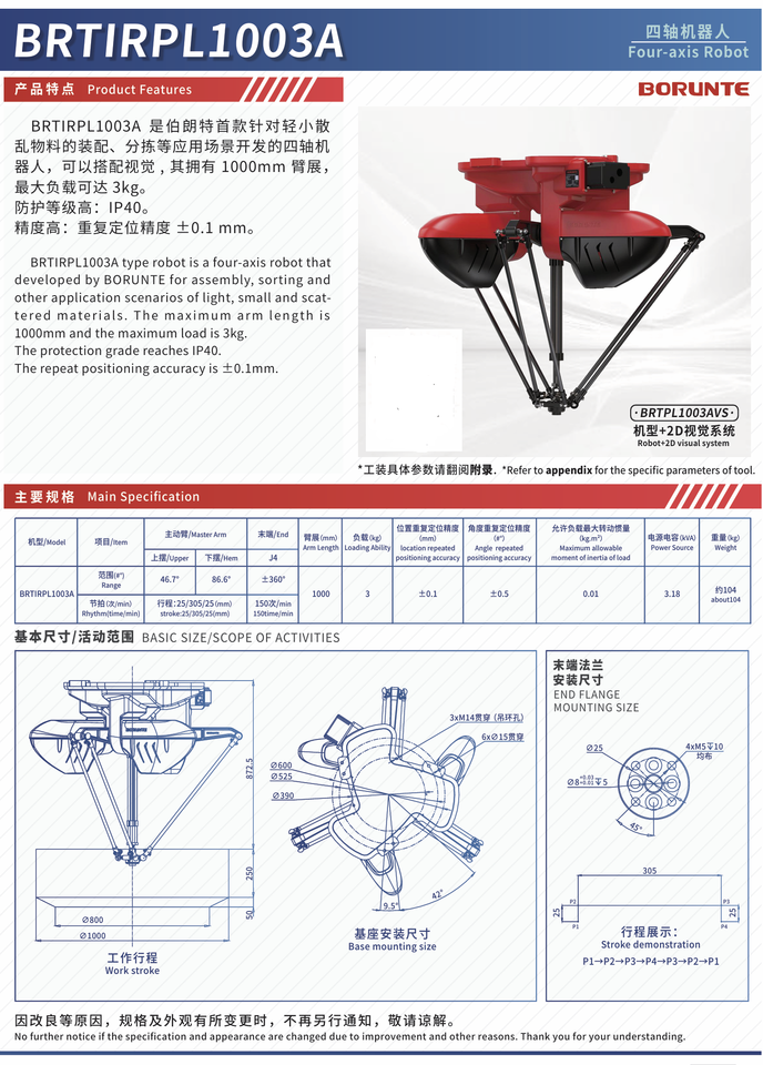 Robot Paralelo Delta BORUNTE, Carga de 3 kg, Longitud del Brazo de 1000 mm, Precisión de 0.1 mm, Logra una Agarre Rápido Mediante un Sistema de Visión, Peso de 50 kg