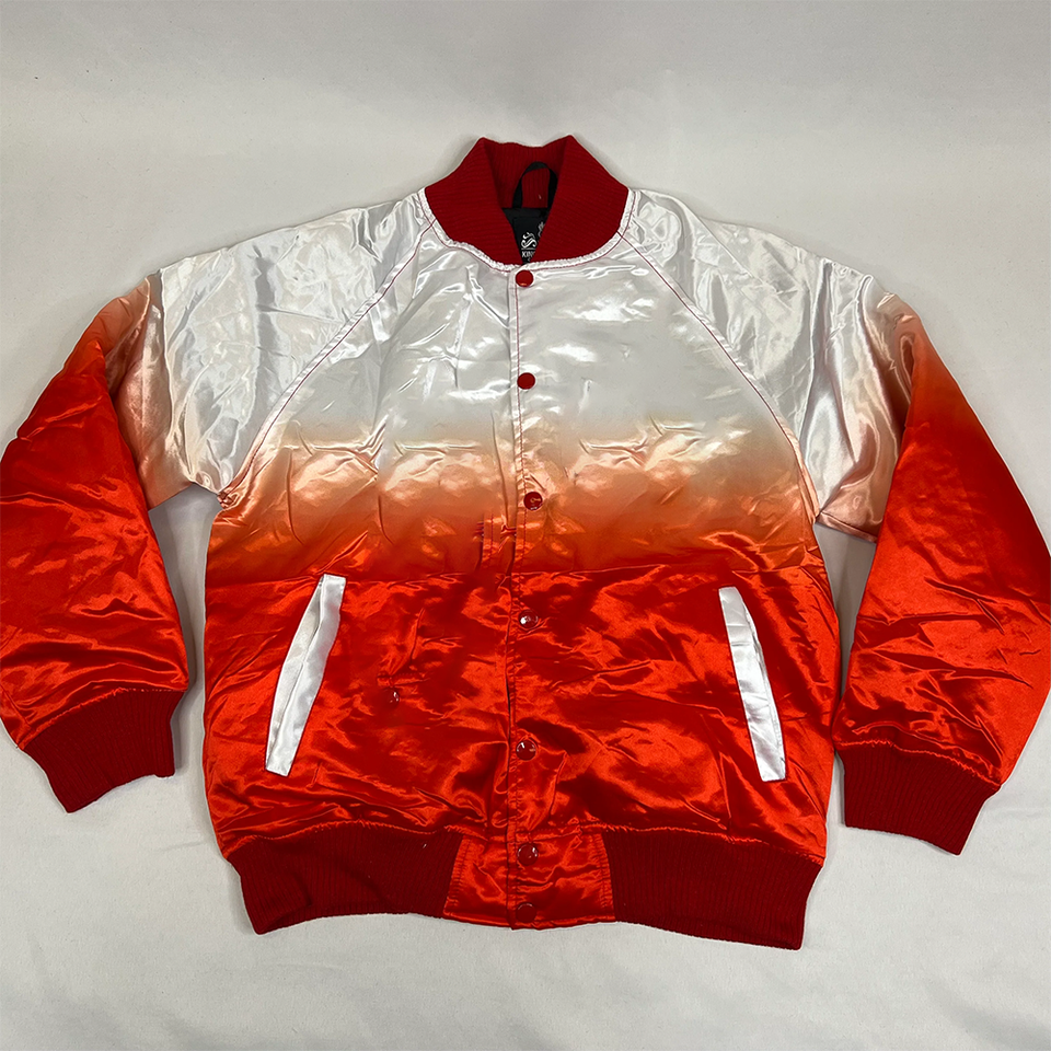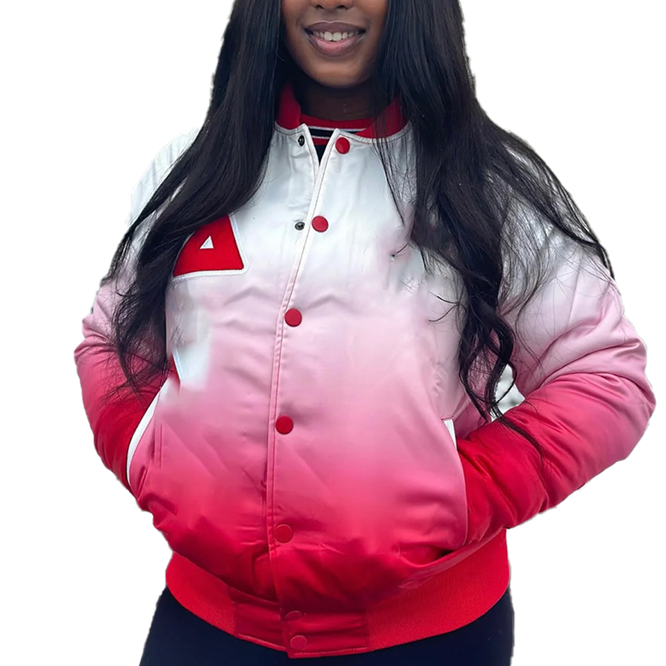 Chaqueta Bomber Satinada Delta Ombre Personalizada para Hermandades y Fraternidades Griegas, Primavera, Frente en Rojo y Blanco, Dos Tonos, Ligera