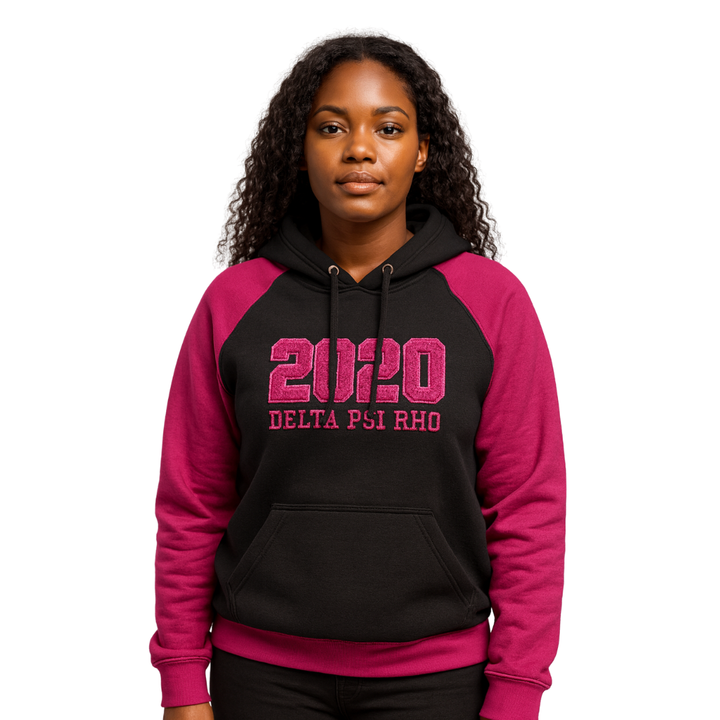 Delta Psi Rho Sorority Raglan manga pulóver Sudadera con capucha negro 80 algodón 20 Poly año de fundación 2020 vida griega ropa informal con capucha