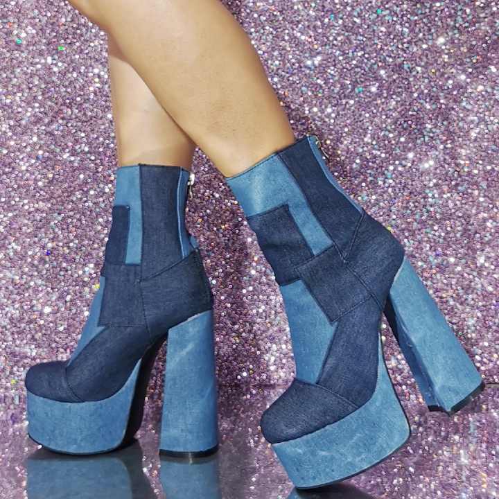 Botines de Plataforma para Mujer con Parches de Mezclilla, Punta Redonda, Cierre Trasero, Talla Grande 47, Tacón Alto y Grueso