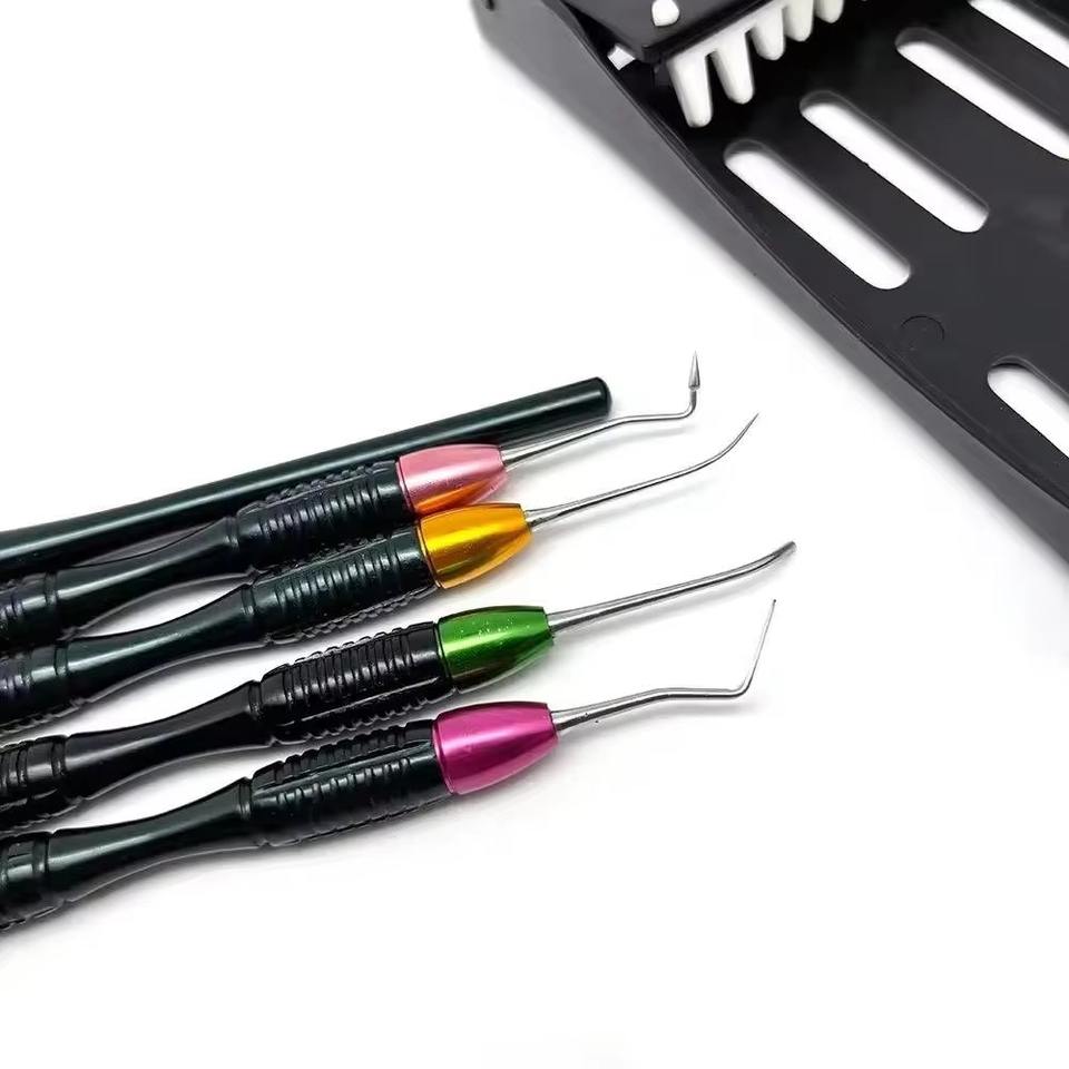 Juego de instrumentos para rellenos dentales de composite con mangos anodizados y bandeja de esterilización autoclavable para clínicas