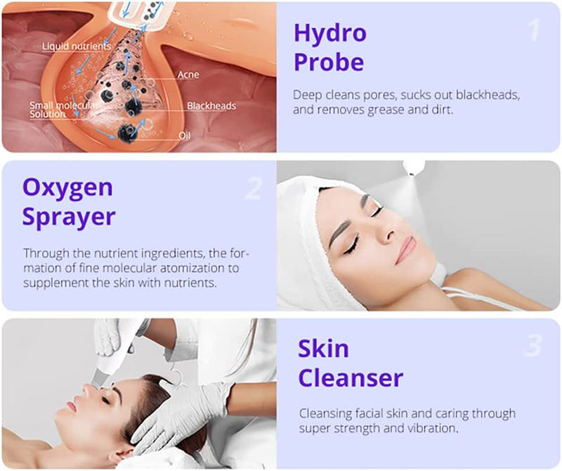 Tratamiento del acné, Ojeras, Eliminación de pigmentos, Rejuvenecimiento de la piel, Estiramiento de la piel, Blanqueador, Quita arrugas, hydro dermabrasionCaracterística