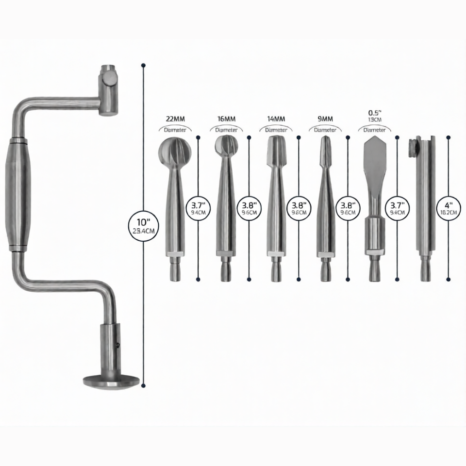 Juego de 7 piezas de instrumental Dermispro: Taladro manual, brocas, extensión de taladro plano, kit quirúrgico de corte de huesos de acero inoxidable CE