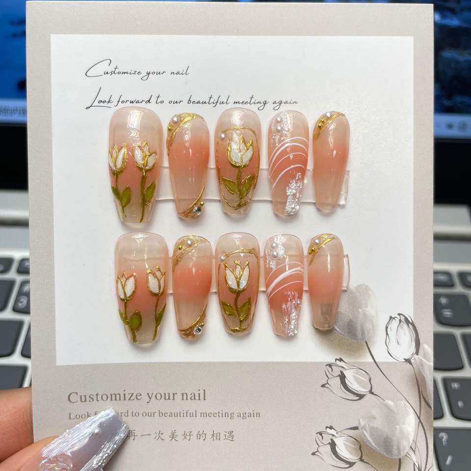 Diseño #48/#352 Fábrica Nuevo diseño Ataúd Arte 3D Tulipán hecho a mano Cubierta completa Prensa en las uñas Larga duración 10 piezas Uñas postizas