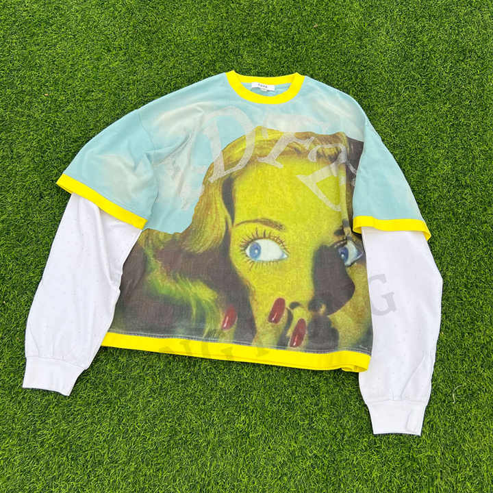 Diseño Dtg Print Street Style Back Full Rhinestone Doble capa Manga larga Camiseta lavada de gran tamaño