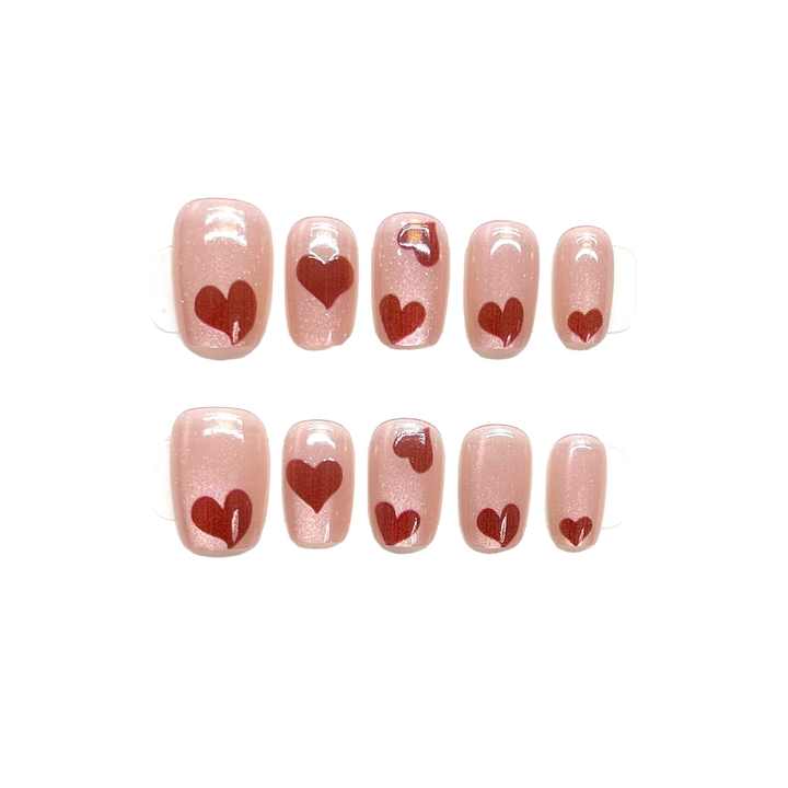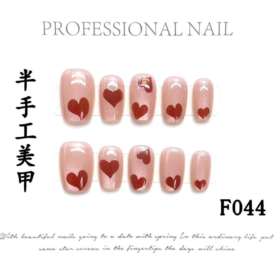 Diseño # F044 Fantasy Coffin Shiny Pink Uñas postizas Diseño de patrón de corazón Cubierta completa Prensa de alta calidad en las uñas