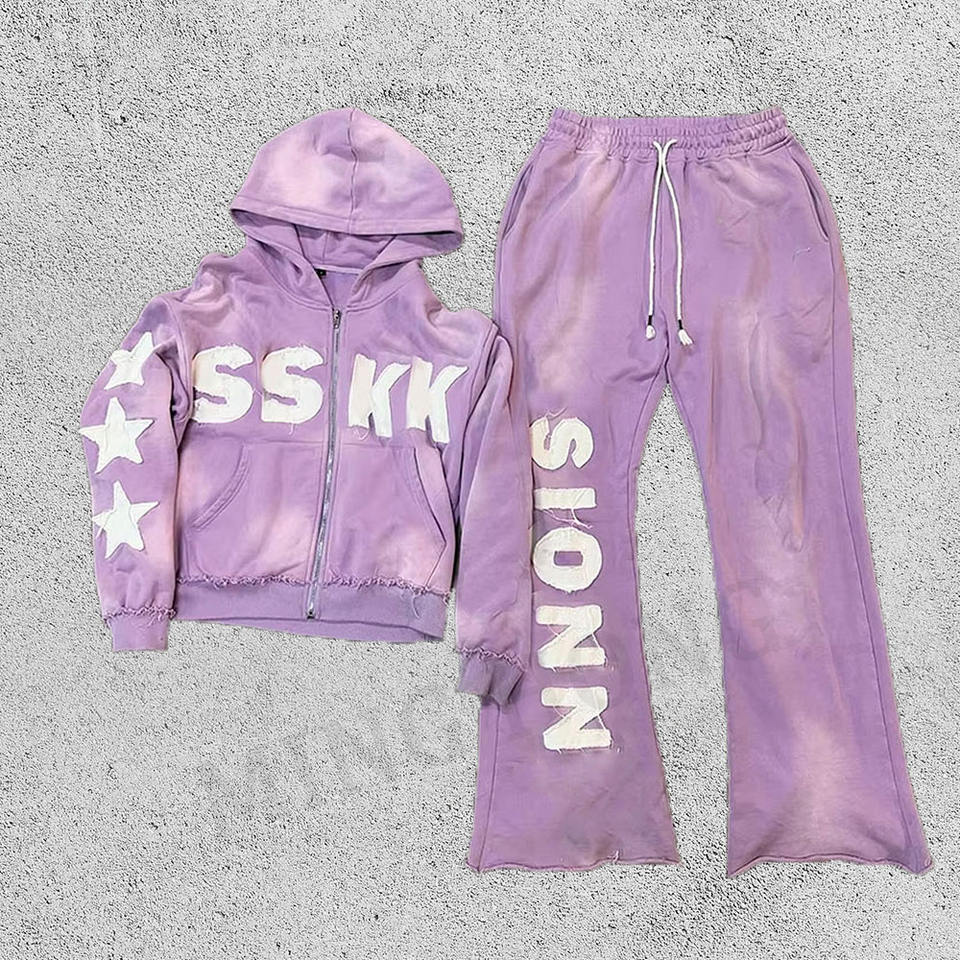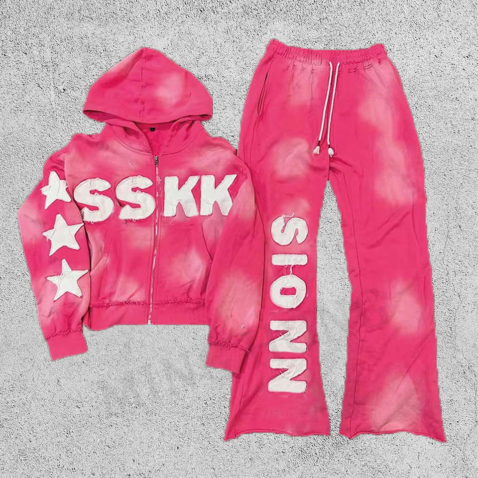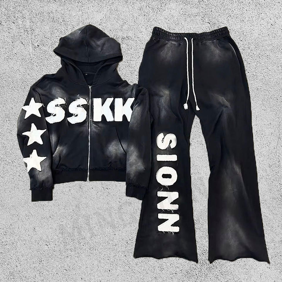 Diseño de pegatina bordado Streetwear Heavyweight Boxy Vintage Sudadera con capucha y pantalones Set Washed Sweatsuit Hombres
