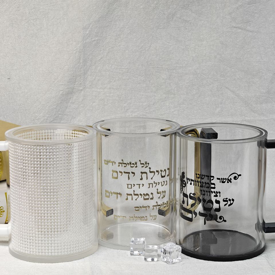 Vaso de acrílico transparente de diseño tradicional para lavarse las manos con doble asa, para rituales religiosos judíos, vaso de Shabat, directo de fábrica