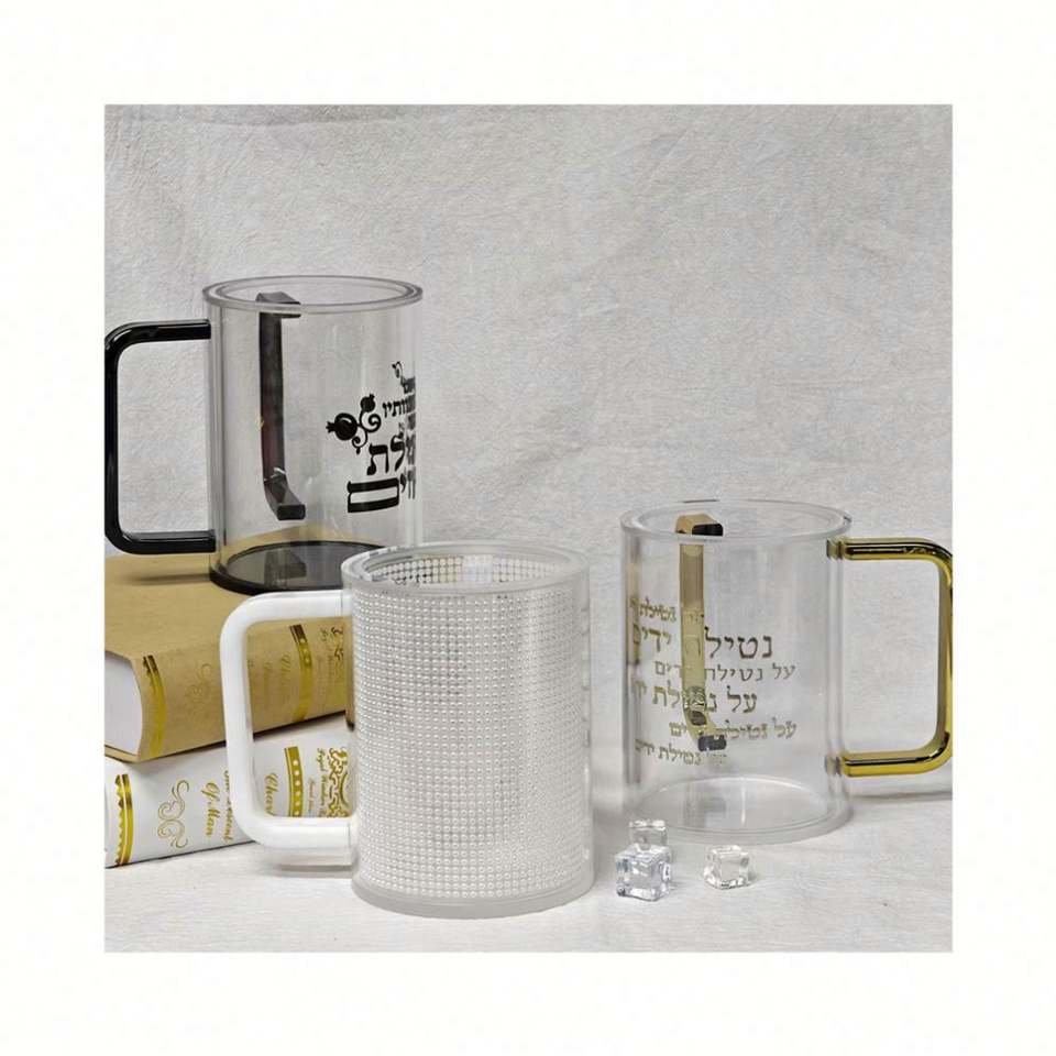 Vaso de acrílico transparente de diseño tradicional para lavarse las manos con doble asa, para rituales religiosos judíos, vaso de Shabat, directo de fábrica