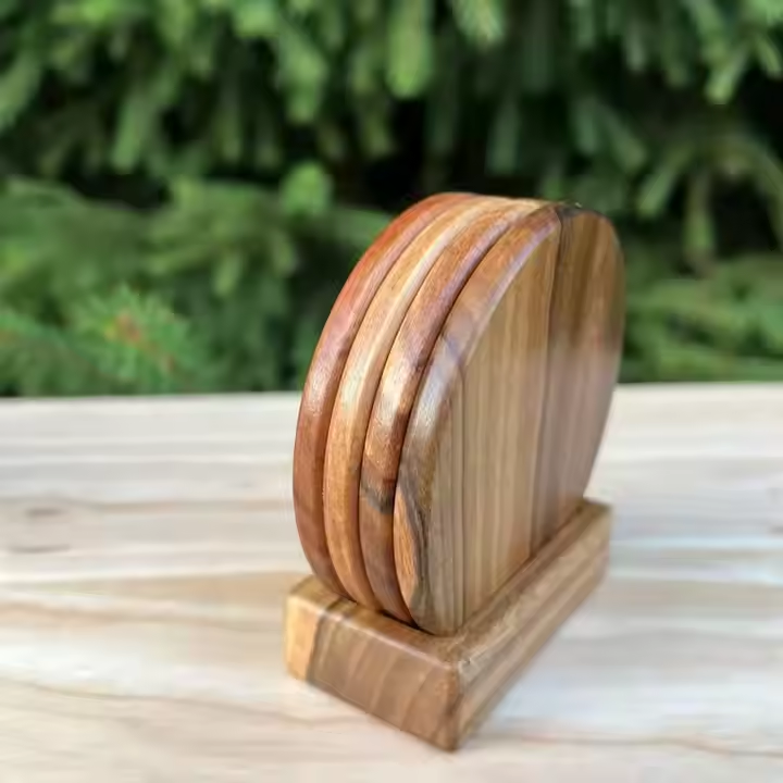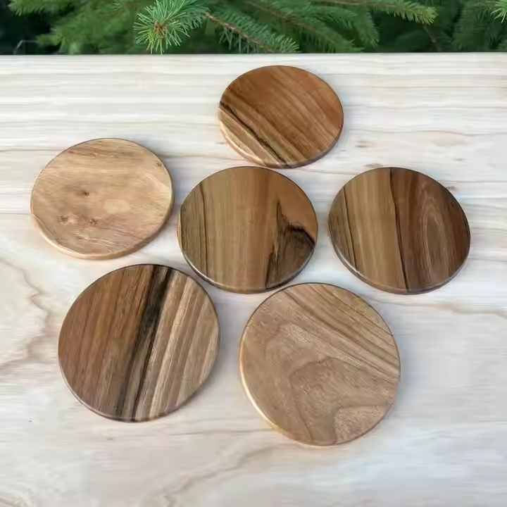 Posavasos de madera de diseño en forma cuadrada redonda con soporte pequeño a precio de venta completo por Crescent Crafts