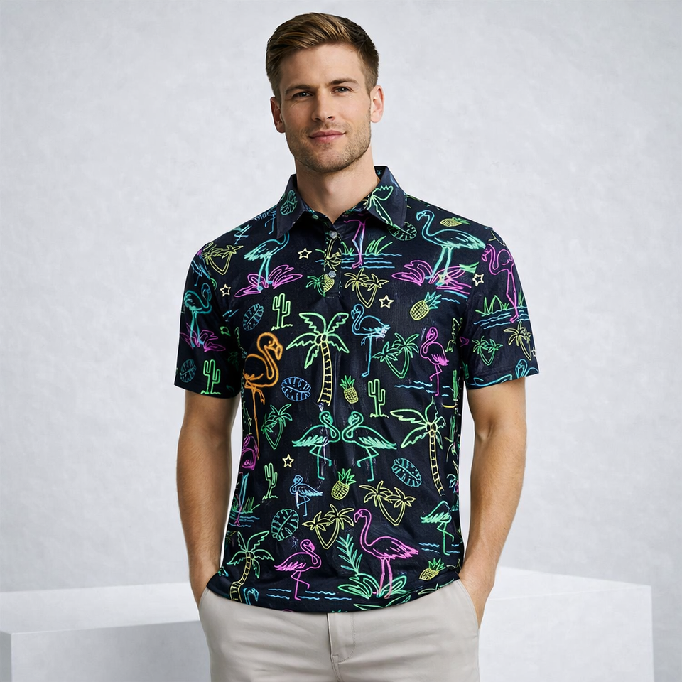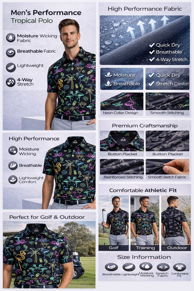Diseña polos de golf deportivos personalizados de corte ajustado, de secado rápido, con estampado sublimado de gran tamaño y logotipo bordado.