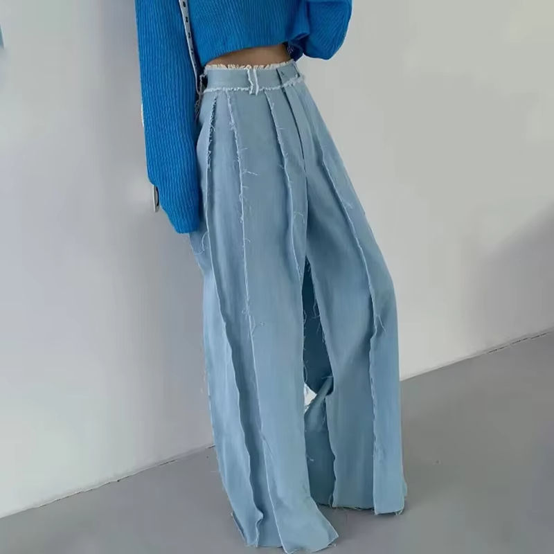 Pantalones lisos de mezclilla sueltos de pierna ancha de cintura alta con borde crudo y bolsillos empalmados designables para mujer