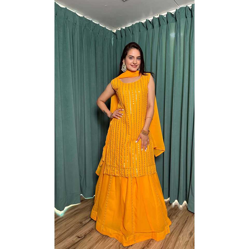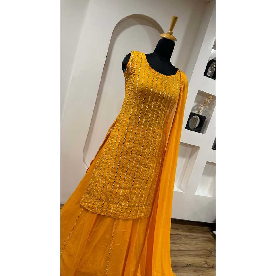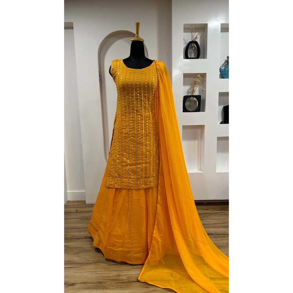 Conjunto de Fiesta de Diseño en Línea A con Top, Falda y Dupatta Hechos a Mano con Cintura Imperio y Trabajo de Espejo de Papel en Tela de Organza