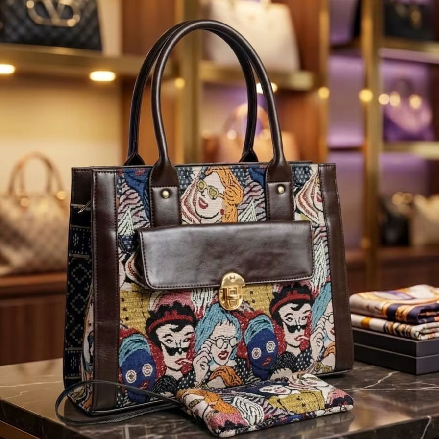 Bolso Tote con Estampado Abstracto de Rostro para Mujer, Bolso Tejido Jacquard con Ribete de Cuero PU y Cierre Metálico