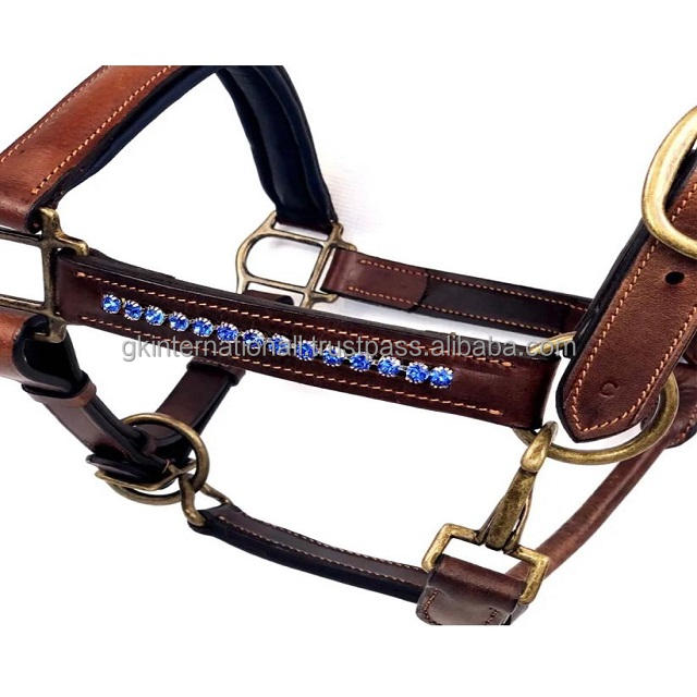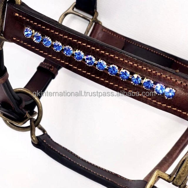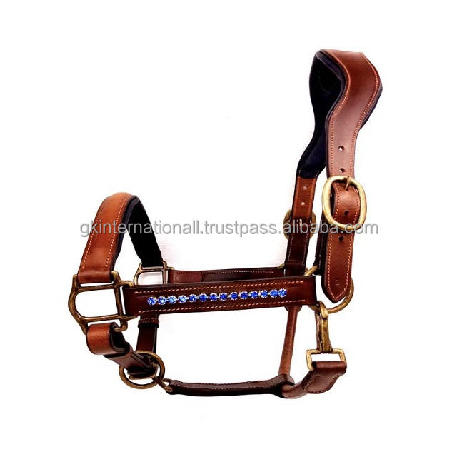 Halter de caballo de cuero marrón hecho a medida, cristales de imitación azules de diseñador, con relleno suave, doble costura, caballo