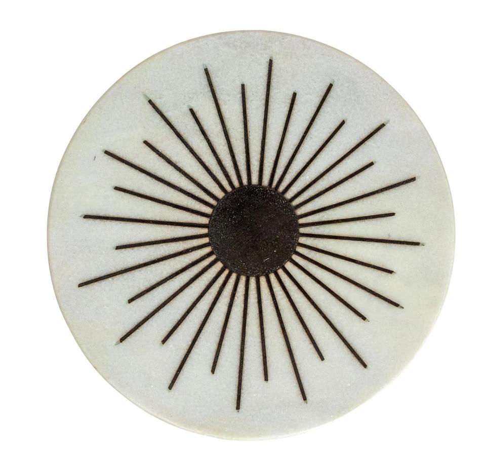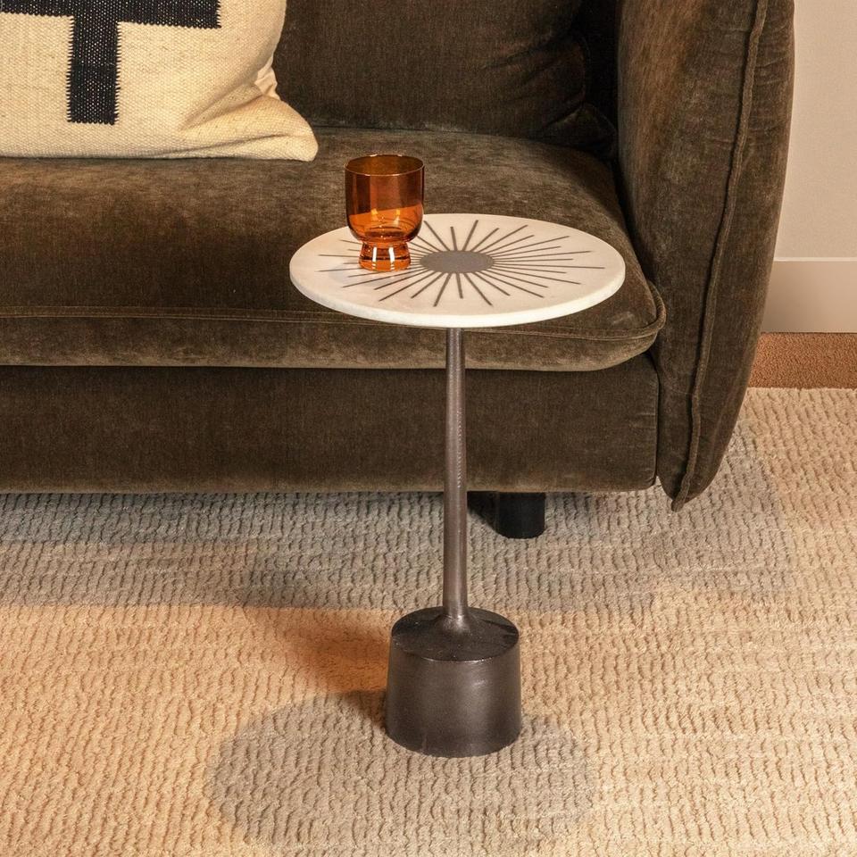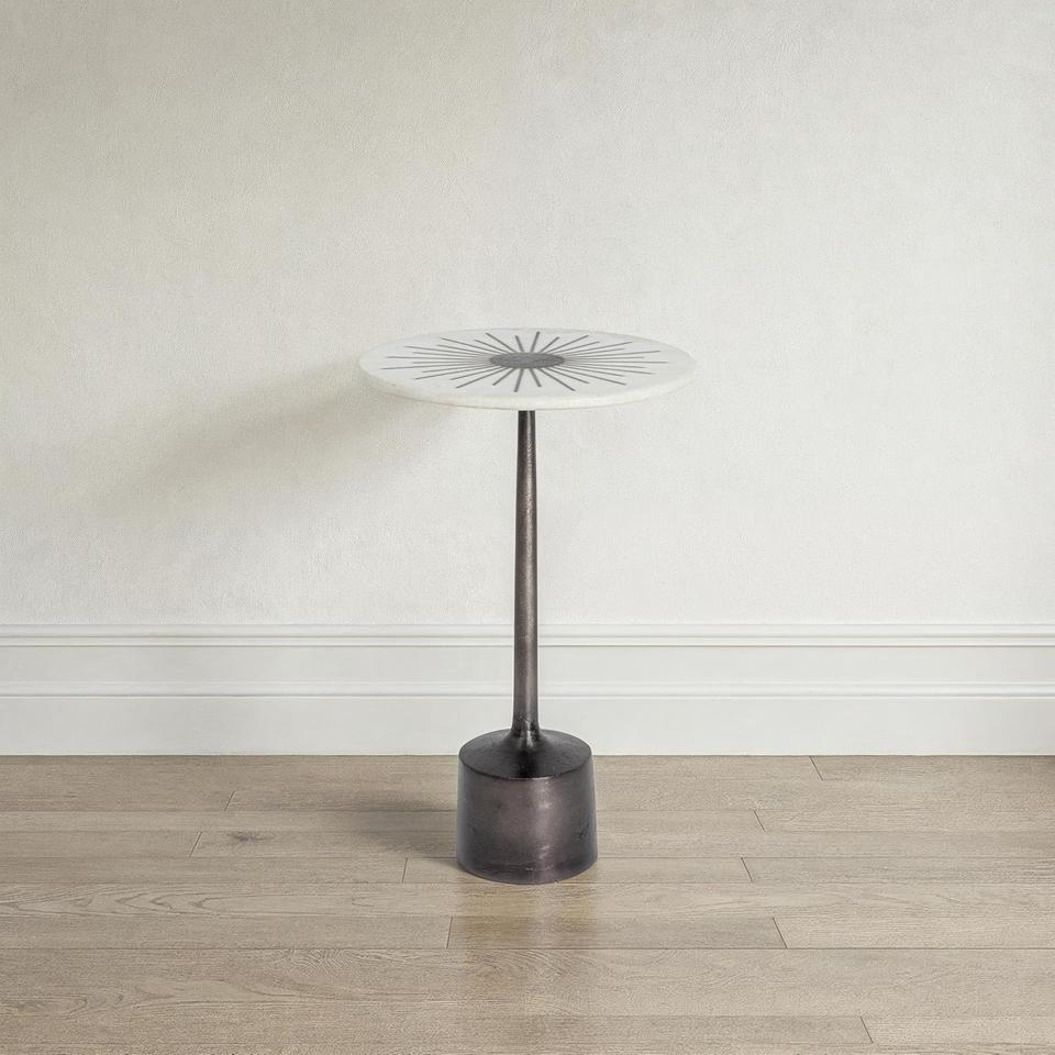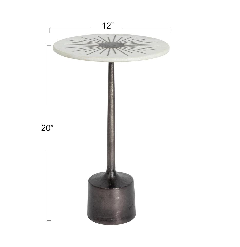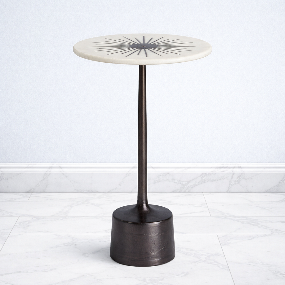 Mesa de Bar de Aluminio Fundido de Diseño con Tapa de Mármol con Incrustaciones Sunburst, Base de Pedestal Elegante, Estabilidad Resistente, Pieza Decorativa Compacta y de Lujo