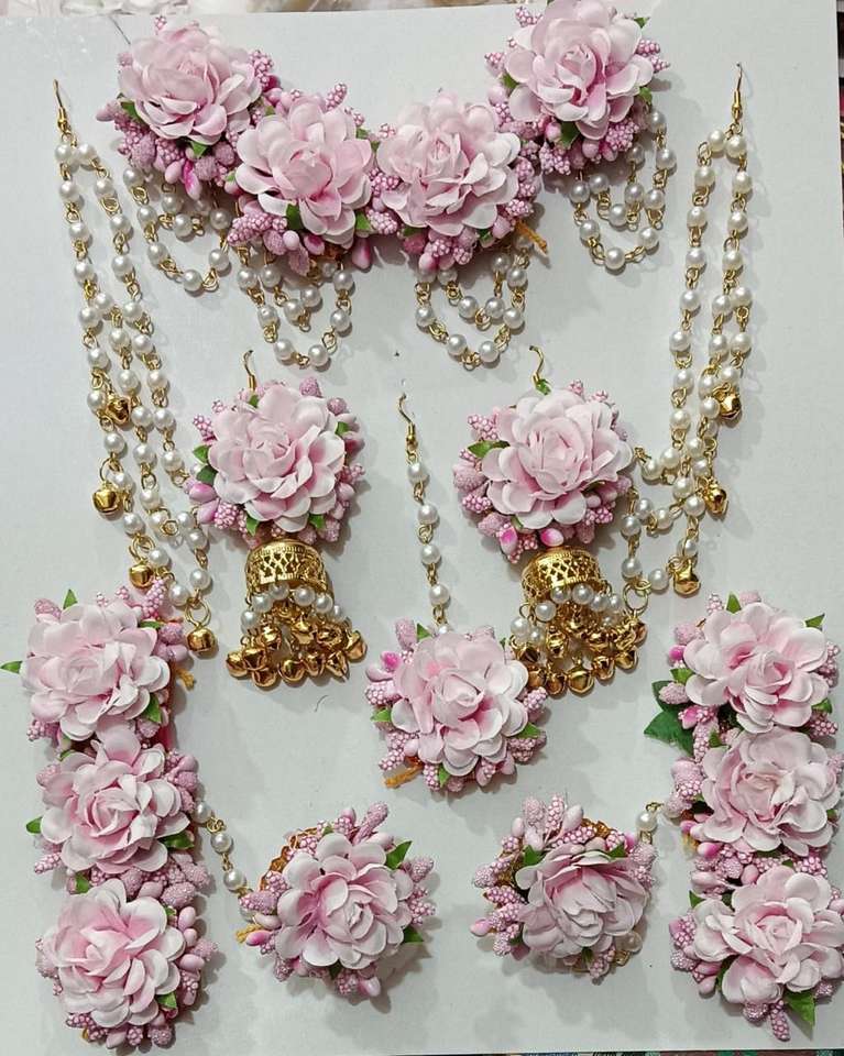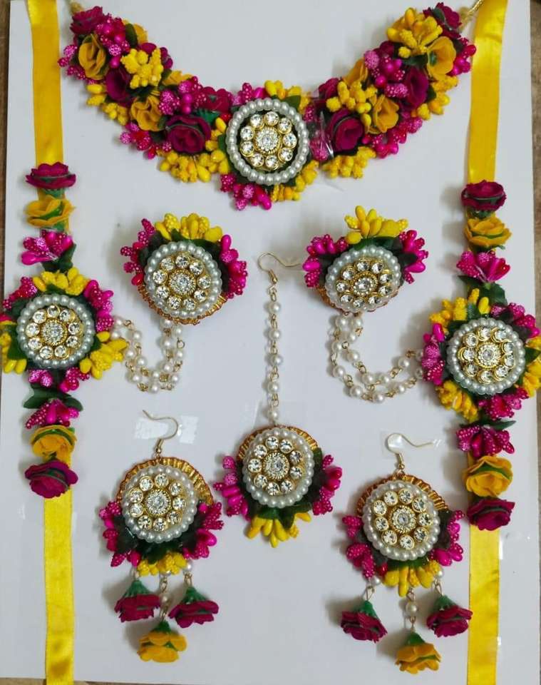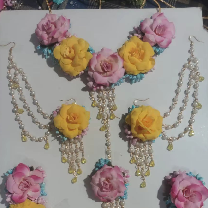 Conjunto Dulhaniya personalizable de diseñador, conjunto de joyería nupcial Floral rosa y amarillo, flores artificiales hechas a mano con joyería de cadena de perlas