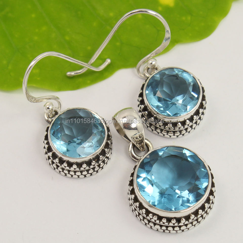Juego de Pendientes de Diseño con Topacio Azul Natural de Corte Brillante de 10*10mm y 13*13mm, Plata de Ley 925, Hechos a Mano para Mujer