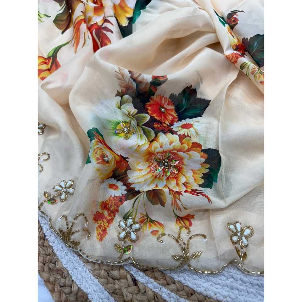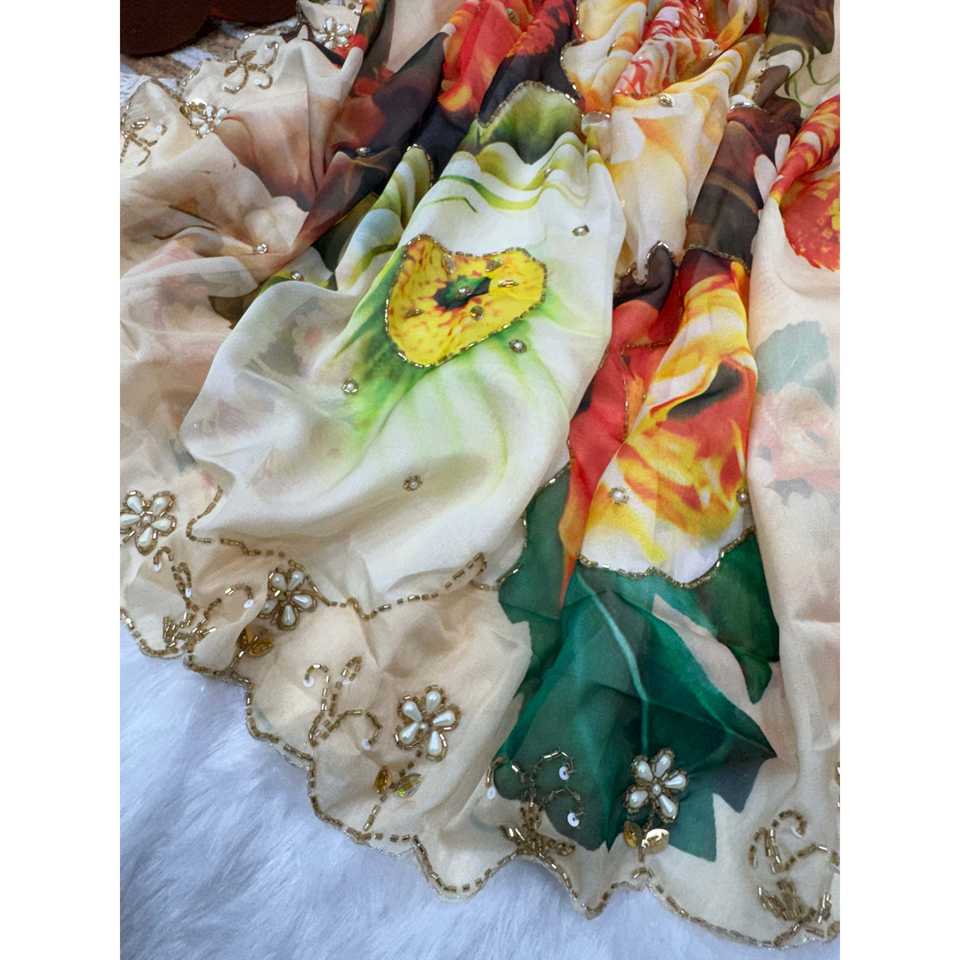 Elegante Chal Largo de Gasa Beige con Diseño Floral Hecho a Mano para Fiestas
