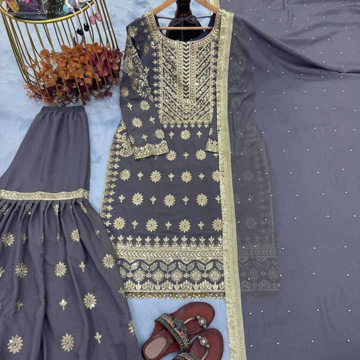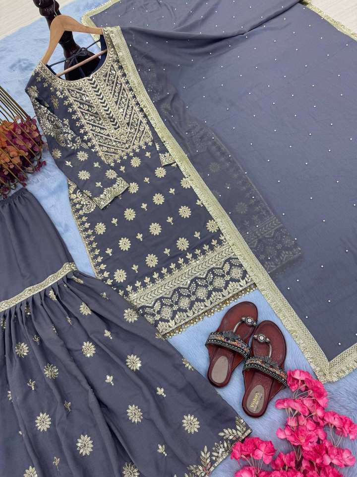 Conjunto de traje de diseñador Georgette Sharara con bordado pesado y trabajo de secuencia Zari para funciones de boda y fiestas