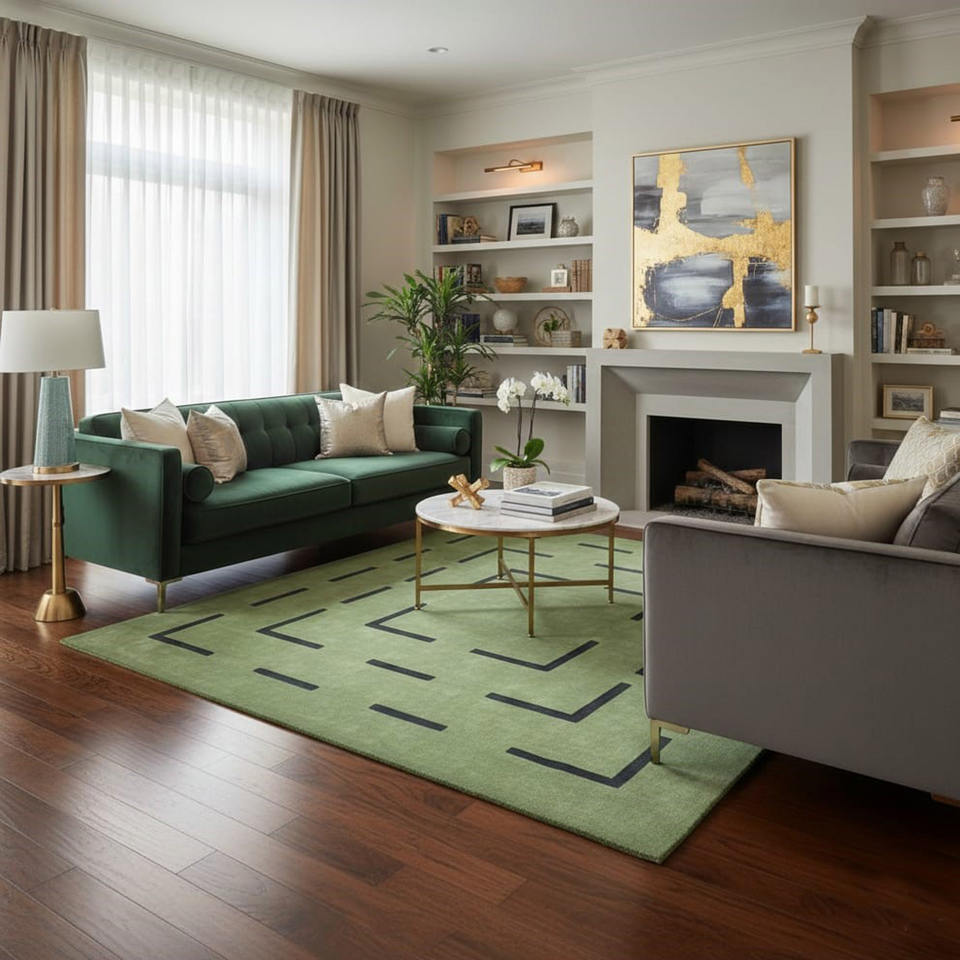 Alfombra de Lana Hecha a Mano por Diseñadores, Alfombra Moderna Geométrica Verde para Sala de Estar o Dormitorio, Alfombra de Tamaño Personalizado