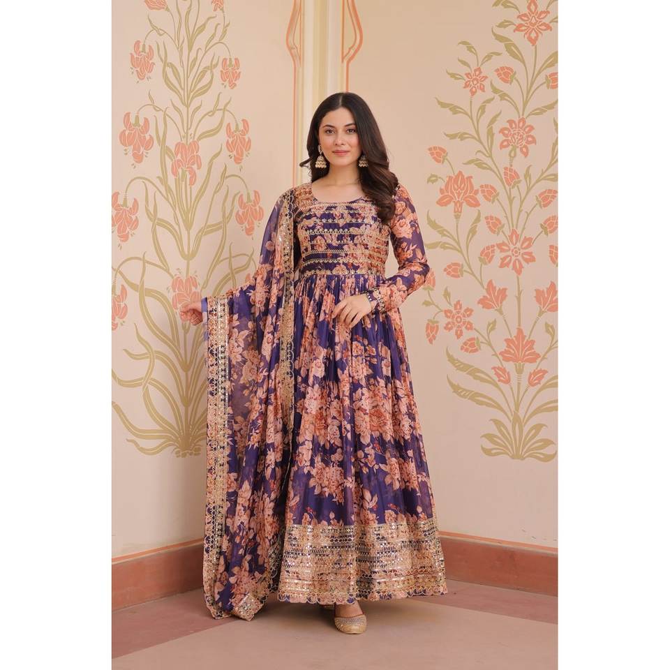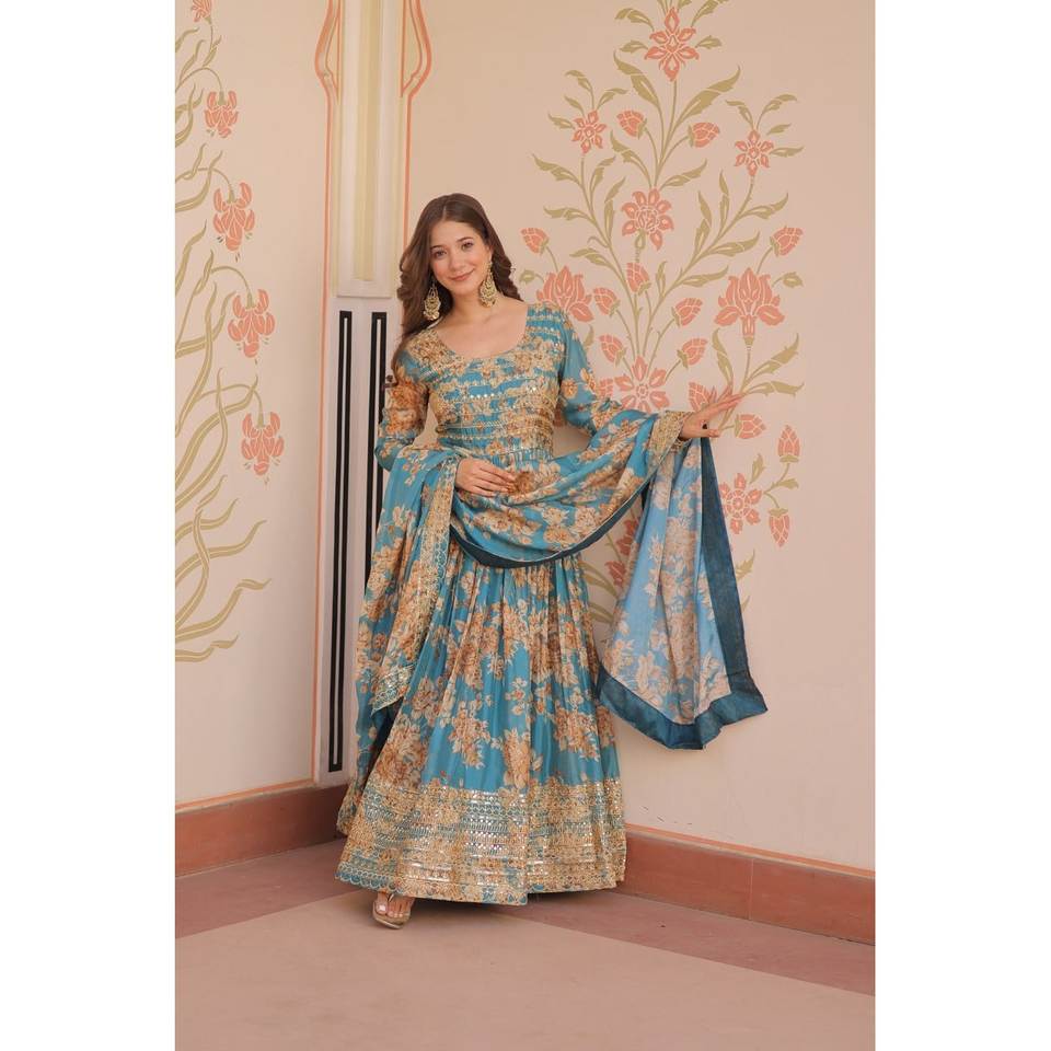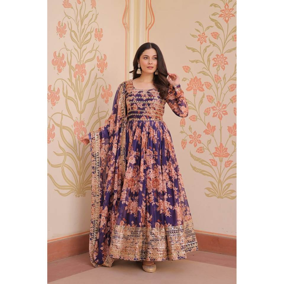Vestido de diseñador hecho a mano, corte en A, cuello cuadrado, estampado floral, organza bordada, cintura imperio, dupatta, para fiestas.