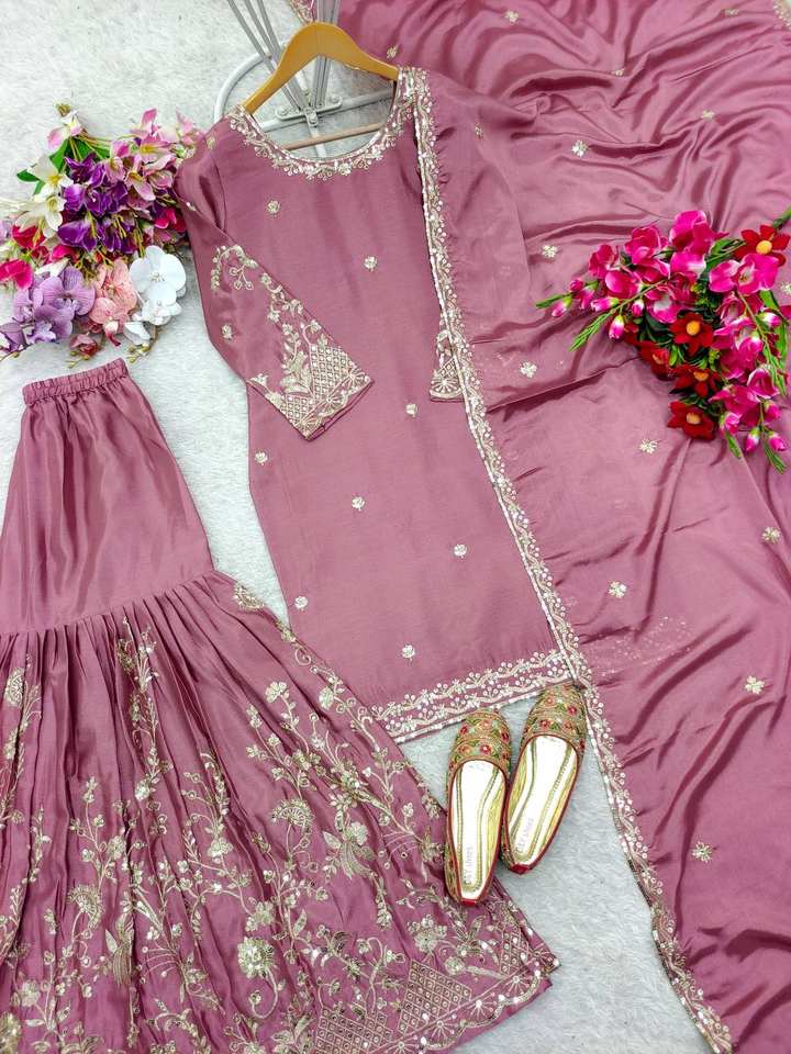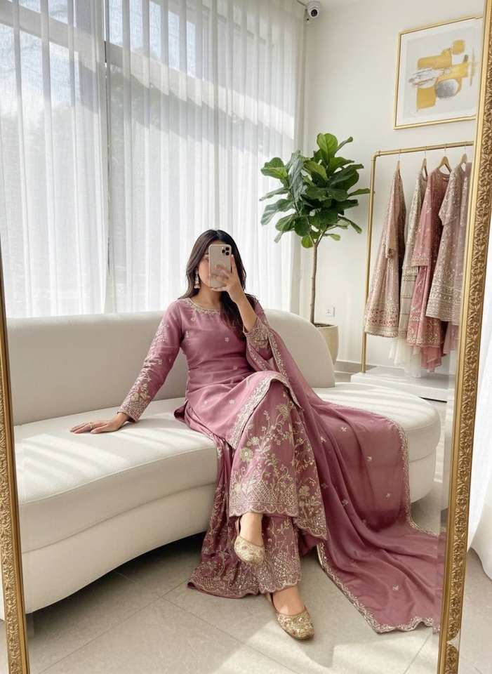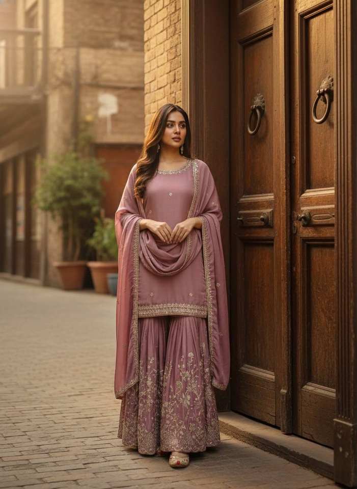 Conjunto de Vestido de Noche de Seda Crepé Natural con Bordado Pesado de Diseño, de Secado Rápido, con Pantalones Plazzo y Dupatta para Bodas y Fiestas
