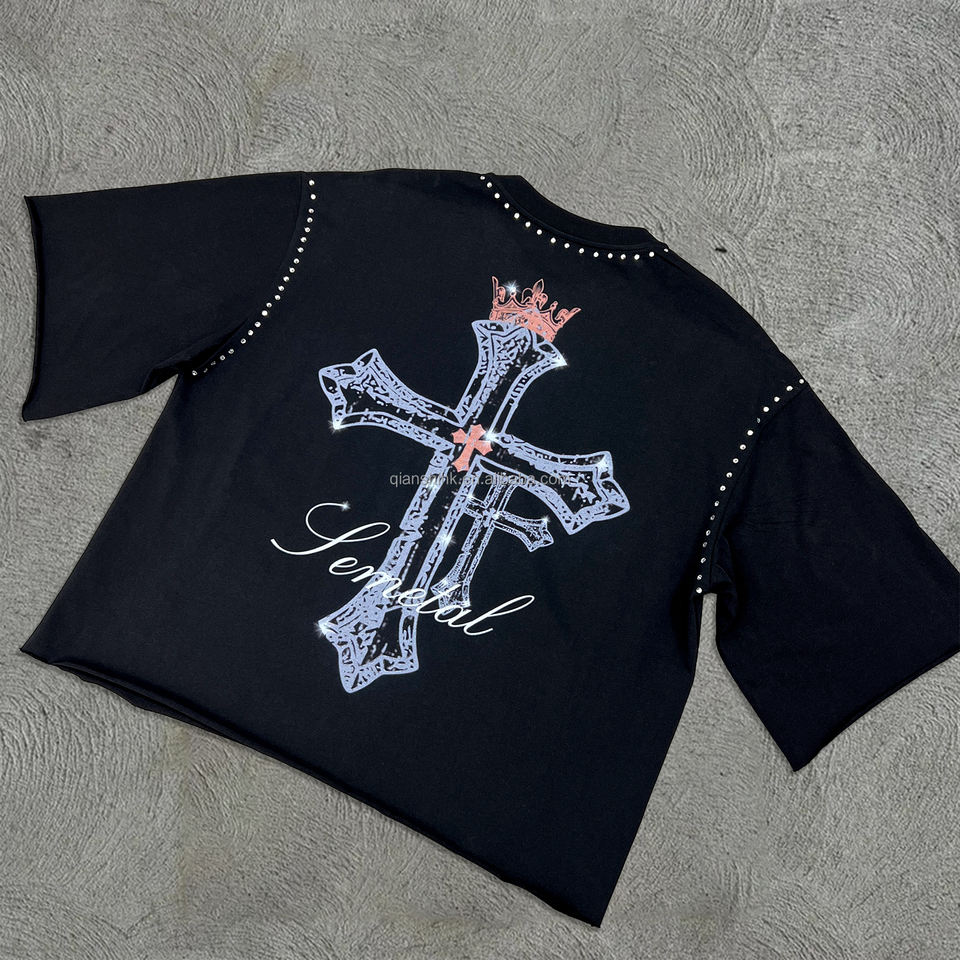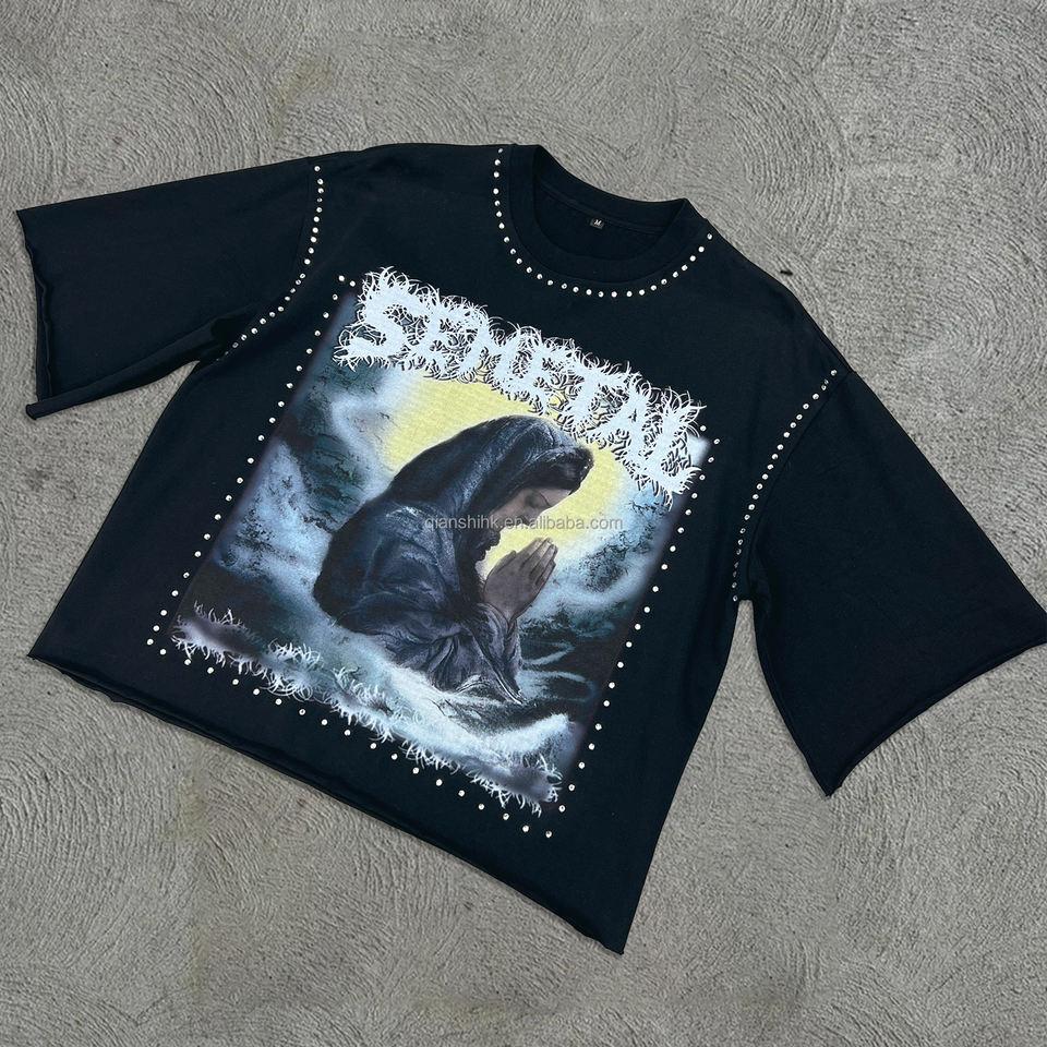 Camiseta cuadrada de peso pesado de diseñador, Camisa de algodón estampada con diamantes de imitación para hombres, camisetas gráficas recortadas de gran tamaño