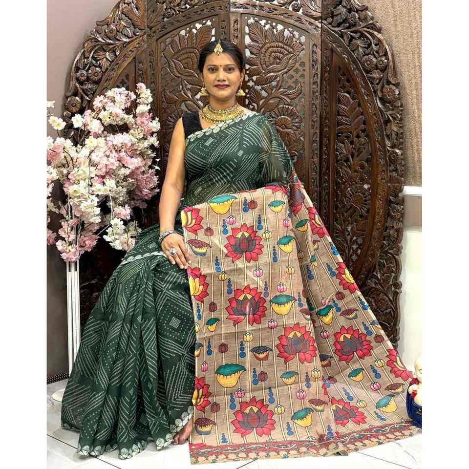 Sari de Lino de Diseño con Estampado Digital Bandhej y Blusa sin Coser, Verde