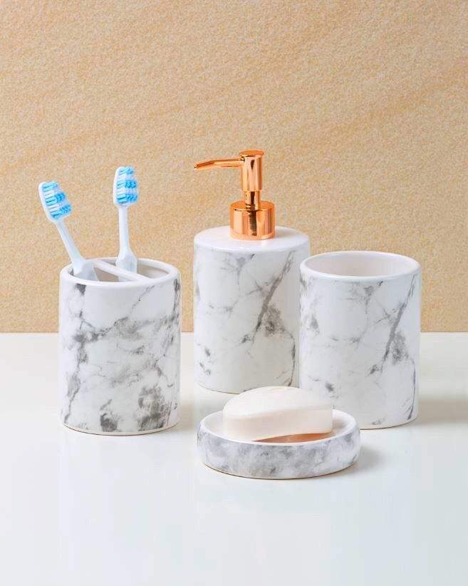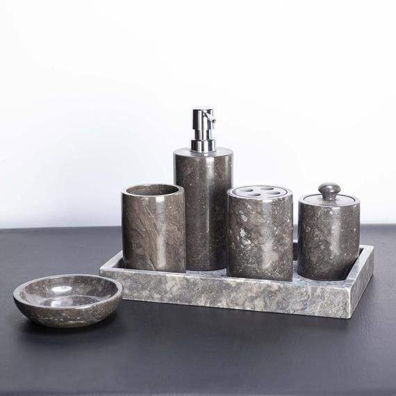 Juego de baño de mármol de diseño, elaborado para complementar interiores elegantes y temas de baño coordinados