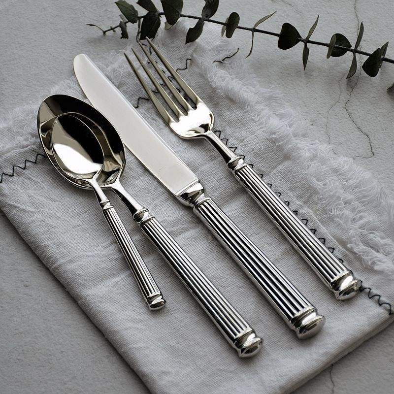 Juego de cubiertos de metal de diseño, elaborado para complementar interiores modernos y arreglos elegantes en la cocina.