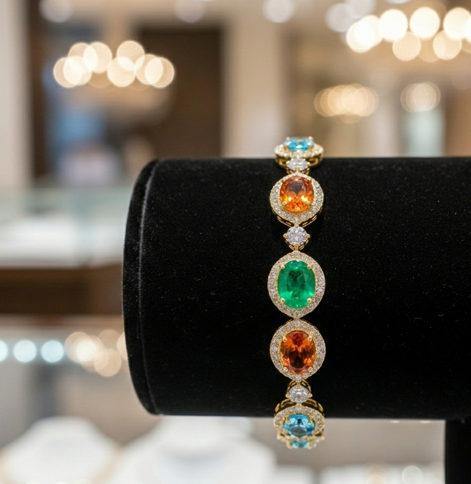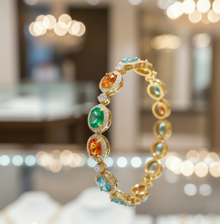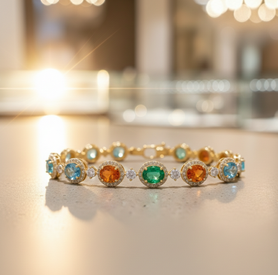 Brazalete de Diseño con Múltiples Piedras Preciosas CZ, Plata de Ley 925, Chapado en Oro de 18K, Brazalete Ovalado con Piedras, 15 Gramos, para Bodas y Fiestas