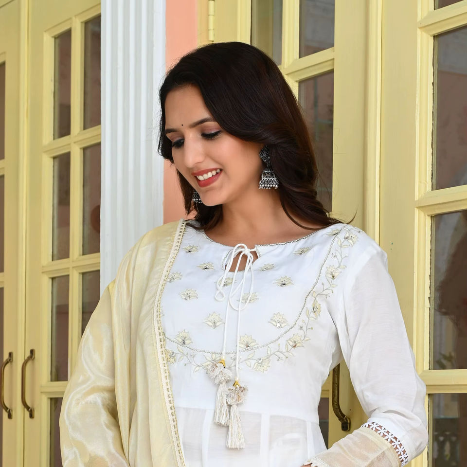 Conjunto de Kurta de Muselina de Diseño con Pantalón y Dupatta para Mujer, Kurta de Muselina con Bordado Floral, Pantalones y Dupatta de Organza