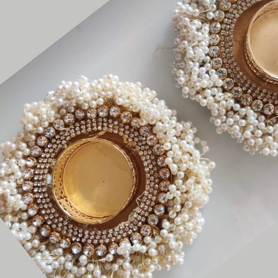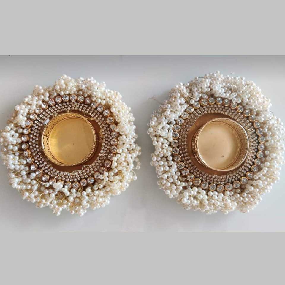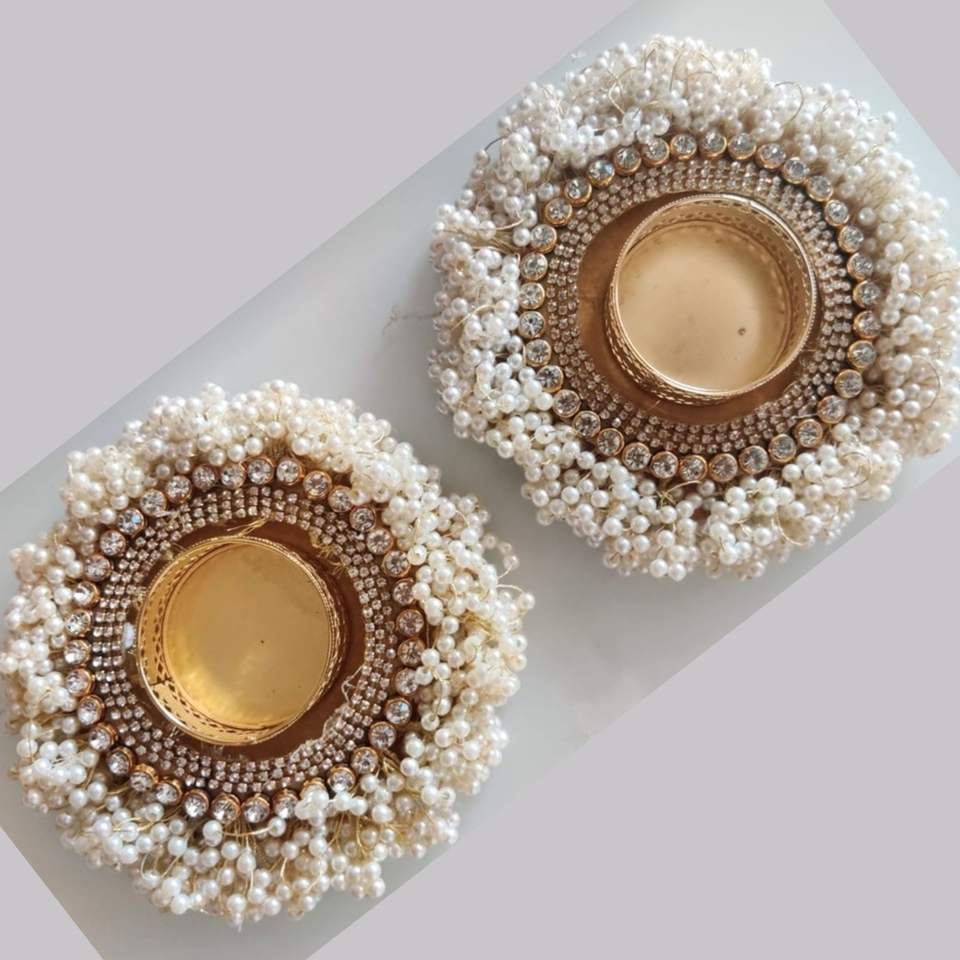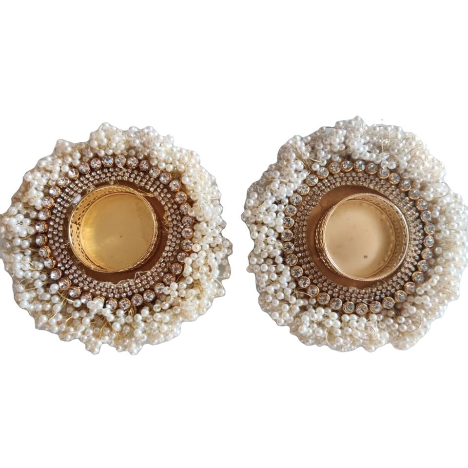 Portavelas de té de forma redonda de diseñador con hilo dorado y cuentas de perlas blancas, portavelas de trabajo Moti para oficina en casa