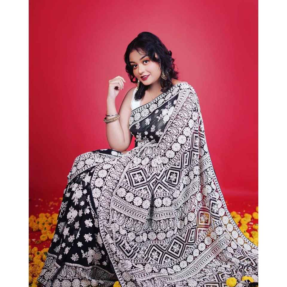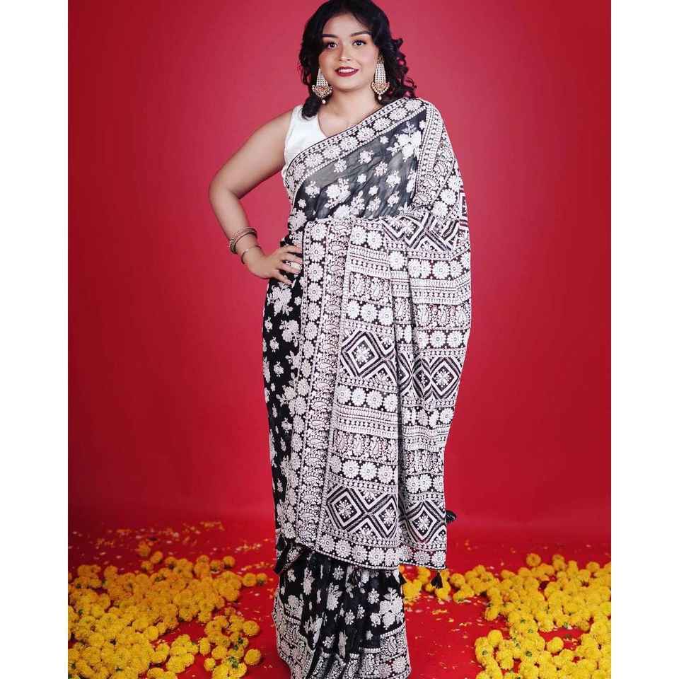 Sari de Diseñador con Bordado de Hilo Lakhnavi, Ropa India y Pakistaní