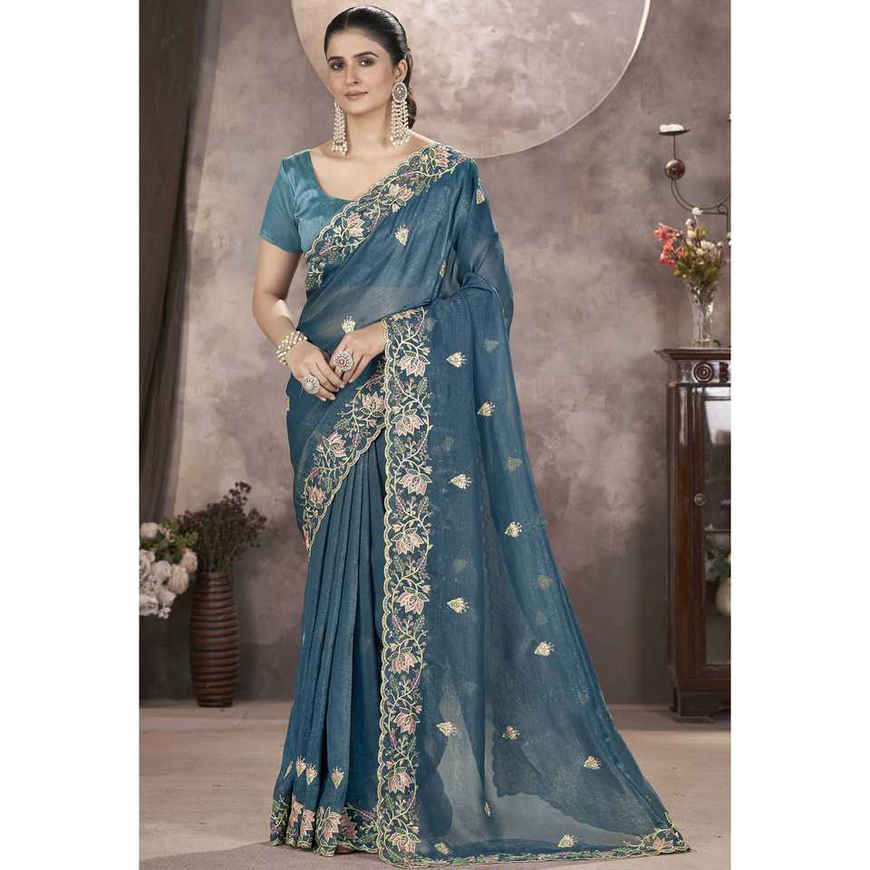 Sari de diseñador con bordado de hilo y desgaste de rendimiento de trabajo de secuencia