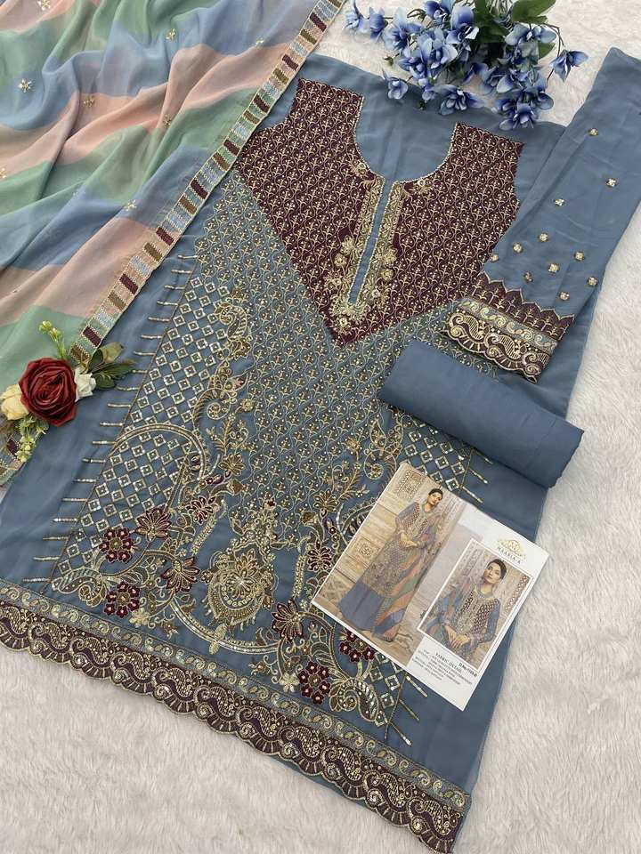 Diseñador Heavy Georgette Fabric Shalwar Kameez Multi-Thread Jari Work Organza Impresión digital Dupatta Latkans Indian Pakistani