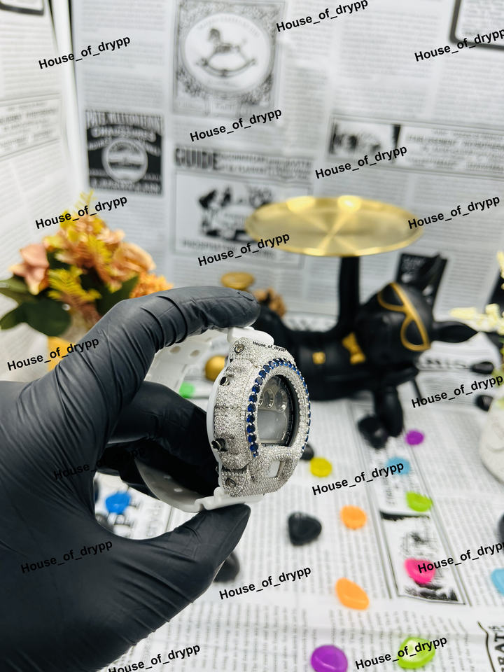 Reloj Digital de Diseño Plateado con Incrustaciones VVS, Bisel Azul y Correa de Goma Blanca, Estilo Hip Hop