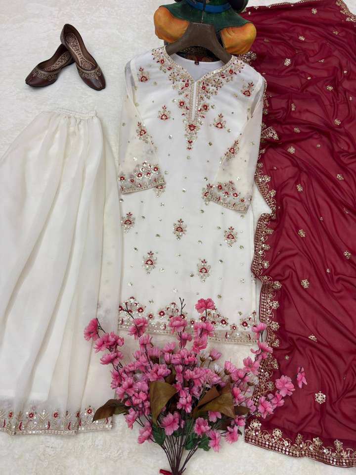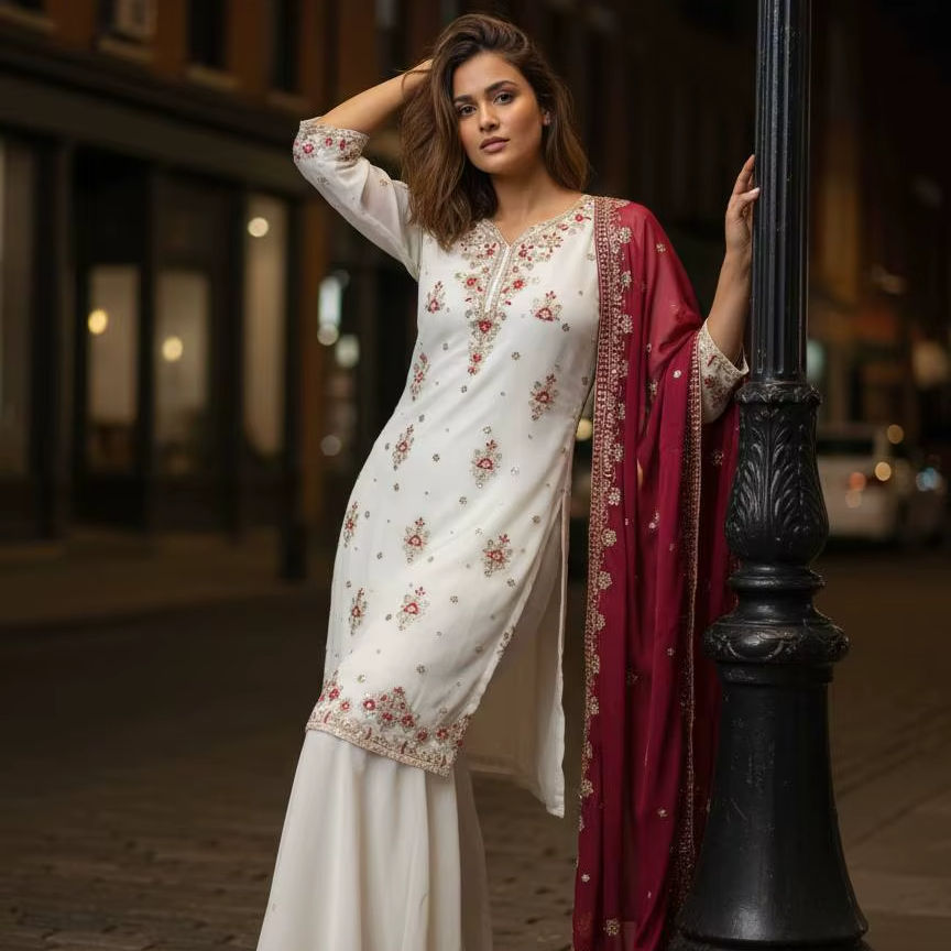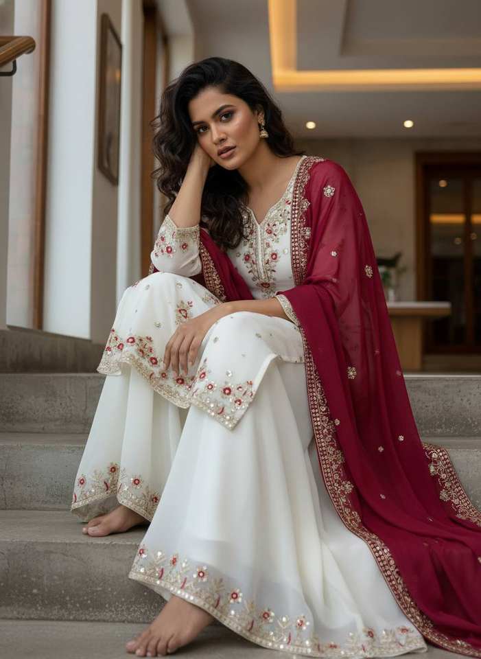 Conjunto Kurti Palazzo de Diseñador Star Georgette con Dupatta para Mujer – Traje Étnico de Fiesta Bordado con Lentejuelas y Zari (M-XXL)