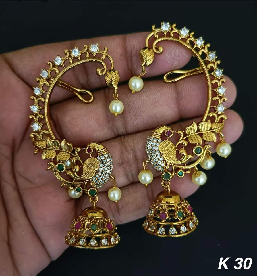 Pendientes elegantes de templo tradicional de diseñador con Jhumka y gotas de perlas | Joyería india de piedra CZ chapada en oro para mujer